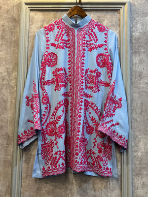 Beautiful fusion of colour, embroidery on long shirt with plain pants