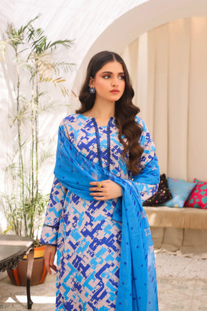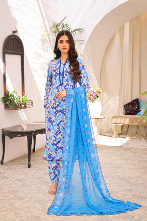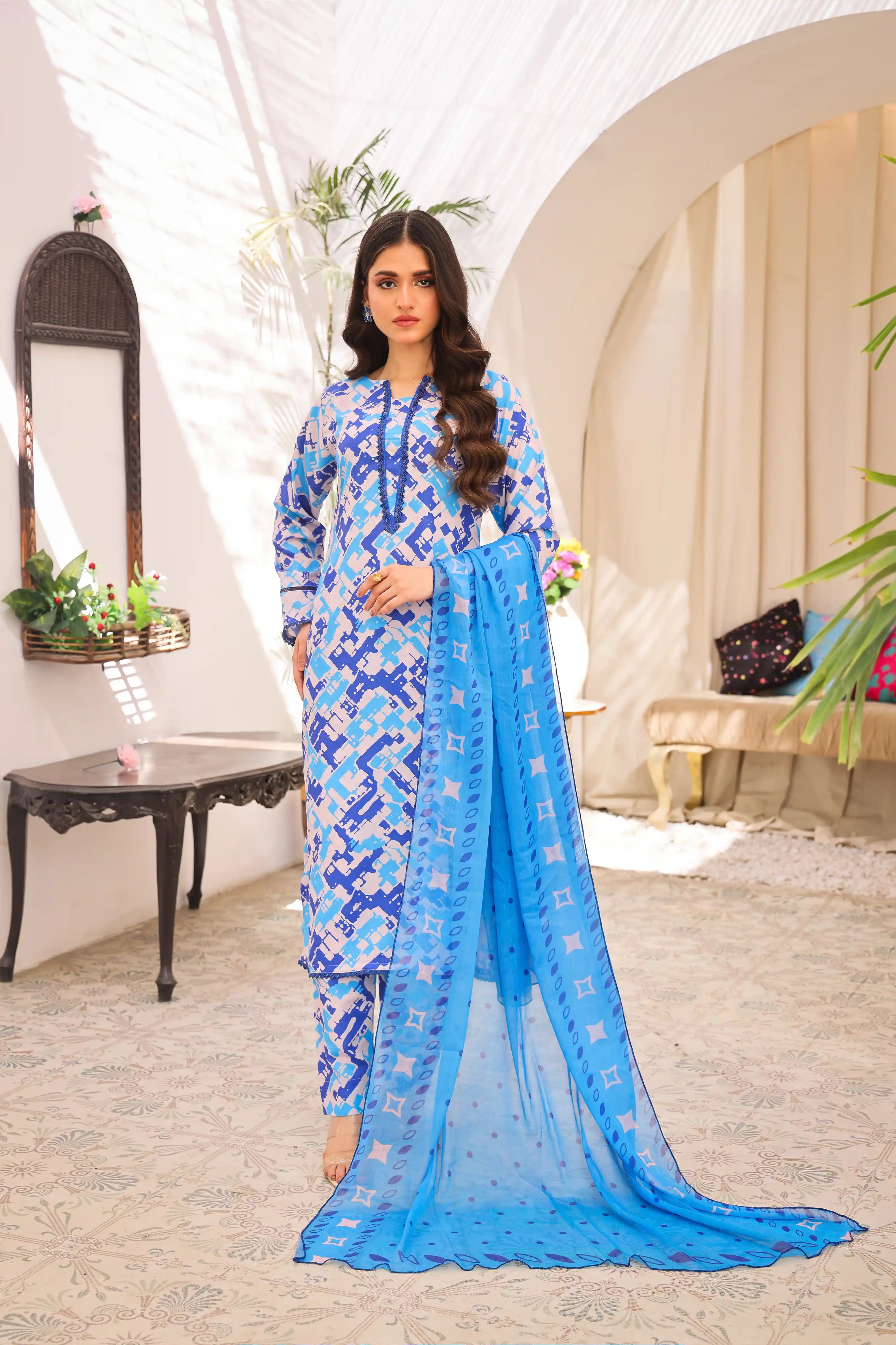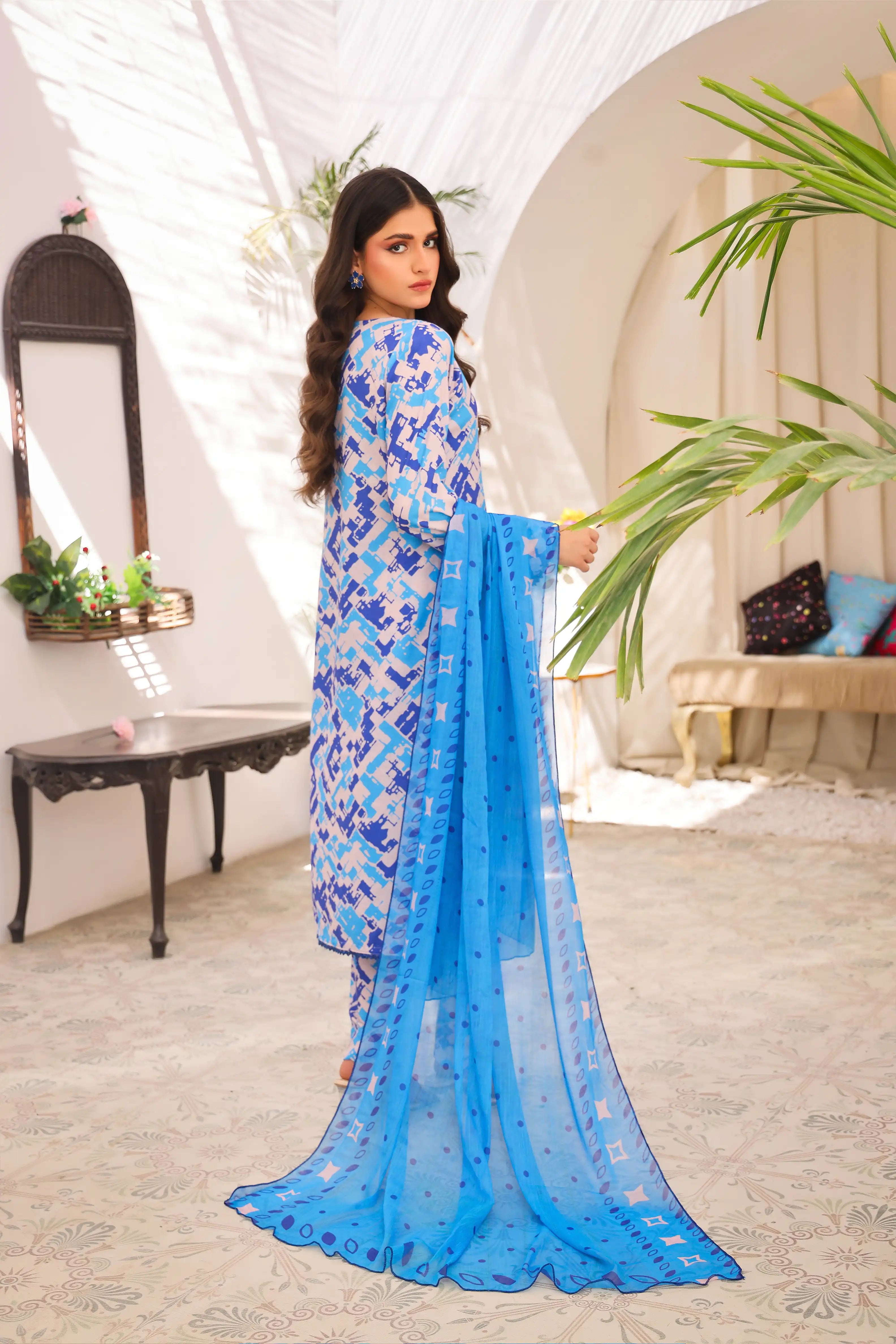 Impermanent Mirage Swiss Lawn with a sky blue base, overall floral print, printed shirt and a soft Chiffon dupatta with a blye base and floral prints. Perfect for a radiant and cheerful look!