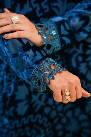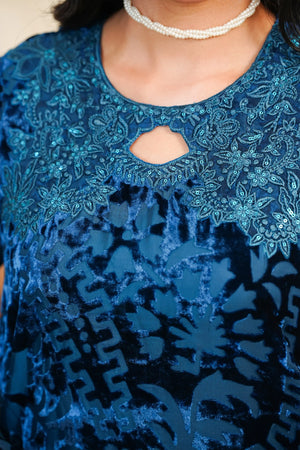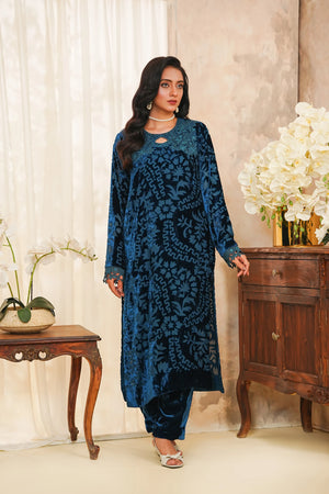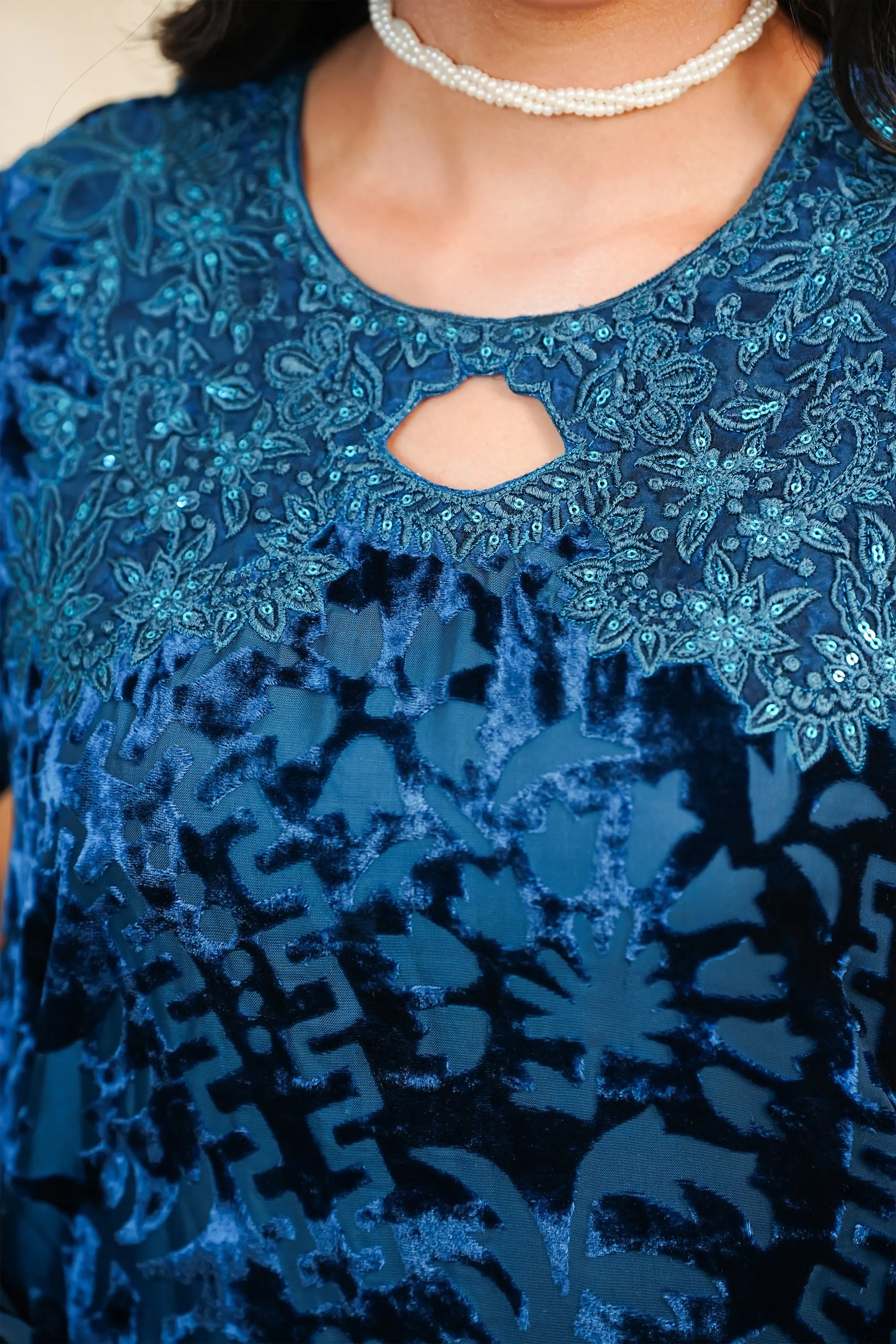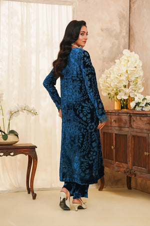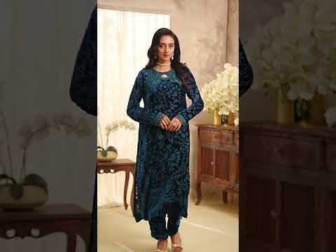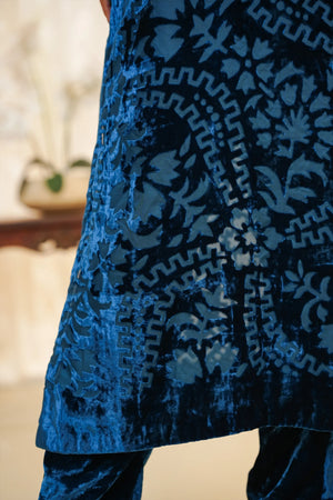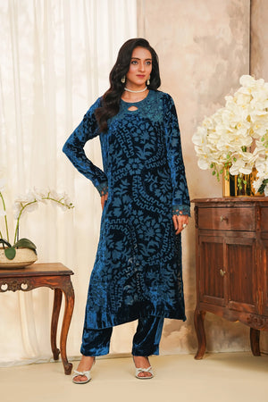The Indigo Bloom is a breathtaking two-piece formal ensemble crafted entirely from rich Deep Blue Velvet, offering a luxurious, monochromatic look perfect for sophisticated winter occasions. The straight-cut shirt showcases a mesmerizing, all-over floral velvet burnout or flocking pattern, and is elegantly detailed with intricate embroidery and shimmering sequence work around the neckline, which features a stylish keyhole cutout. The sleeves are finished with complementary embroidered borders, and the suit is completed by matching tailored Velvet trousers for a unified and opulent silhouette.🌌