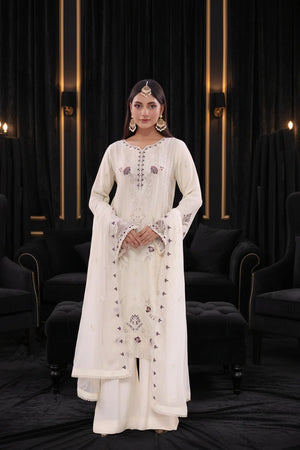 Each 3-piece set includes a ready-to-wear luxury embroidered chiffon shirt, an exquisite embroidered chiffon dupatta, and a dyed viscose trouser tailored for comfort and refinement.