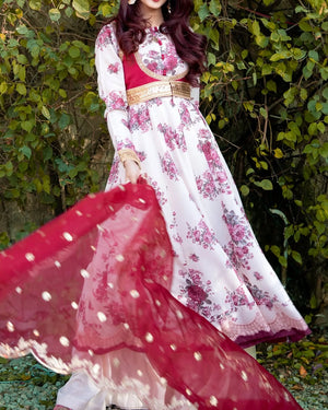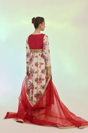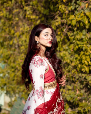 Celebrate Eid with elegance in this ivory and red embroidered 4 piece set. Featuring a kalidaar pishwas paired with embroidered koti. The look is completed with a lehenga and an embroidered dupatta. A perfect fusion of classical charm and modern sophistication.