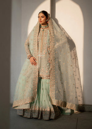 Step into bridal bliss with our Janna Ensemble from Shehnai Bridals Collection”24. This captivating powder blue ensemble showcases a meticulously crafted shirt with intricate embroidery, a majestic four-sided embroidered organza dupatta, and a flowing organza garara, all woven together with a touch of magic.