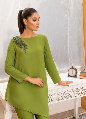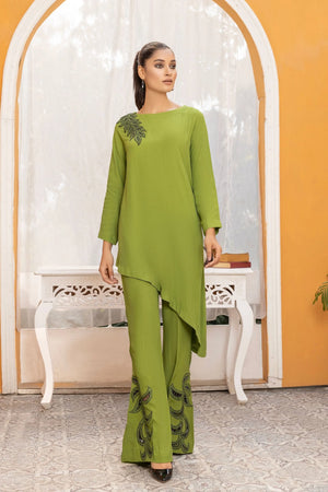An asymmetrical fusion shirt in grip georgette. Pair it with matching pants. The 3D embroidery on the shirt and hand embroidery on the trousers creates a dazzling detail.