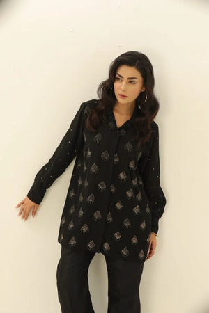 This stunning black outfit includes a Georgette chiffon shirt with black pearl embellishments and beautiful sitara designs. The shirt is perfect for special events, as the scattered embellishments give it a touch of sparkle and sophistication. Paired with luxurious Korean raw silk pants, this ensemble ensures that you leave a lasting impression by exuding elegance and refined style.