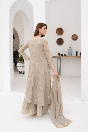- Additional Description: There is exquisite embroidery work in vertical patterns, which exudes grace and elegance, is a marvel of craftsmanship and design. The designer's exquisite use of the zari, sitara, stone work , mirror work and sequin embroidery technique enhances this lovely dress. A gorgeous chiffon dupatta with a kiran lace border completes the ensemble. Make use of Mona Embroidery to showcase your individual style and embrace it. Note: Measurements very according to designs. Colors may appear slightly different. Remember: Dry Clean Only