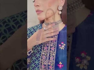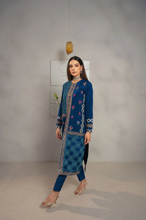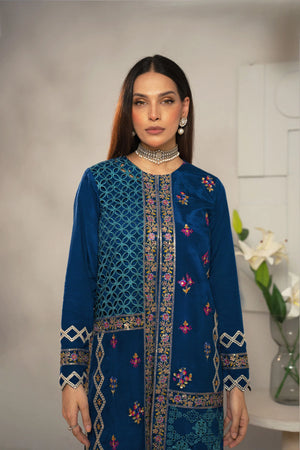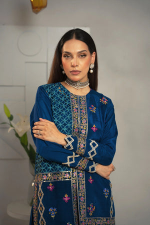 Step into refined elegance with this striking 3-piece royal blue jacket dress, designed to make a bold yet graceful statement. The ensemble features a long embroidered jacket, beautifully detailed with intricate patterns along the front and sleeves embroidery that add a touch of luxury and sophistication.