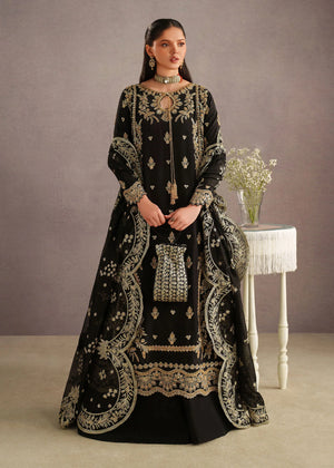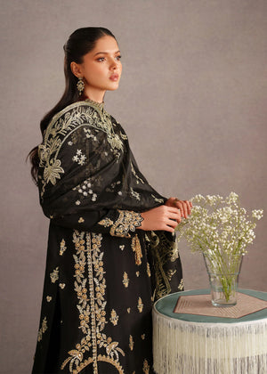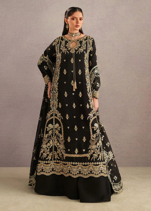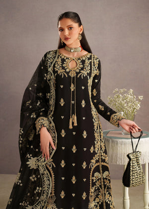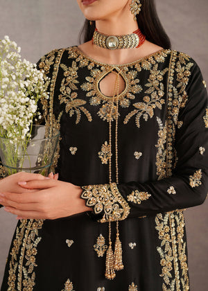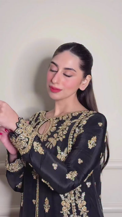 A timeless black traditional ensemble adorned with intricate antique gold embroidery, exuding regal elegance. The outfit features a beautifully detailed long kameez with delicate floral and paisley motifs scattered across the fabric, complemented by an ornate embroidered hem. The neckline is enhanced with fine embellishment and a subtle keyhole detail, adding a touch of sophistication.