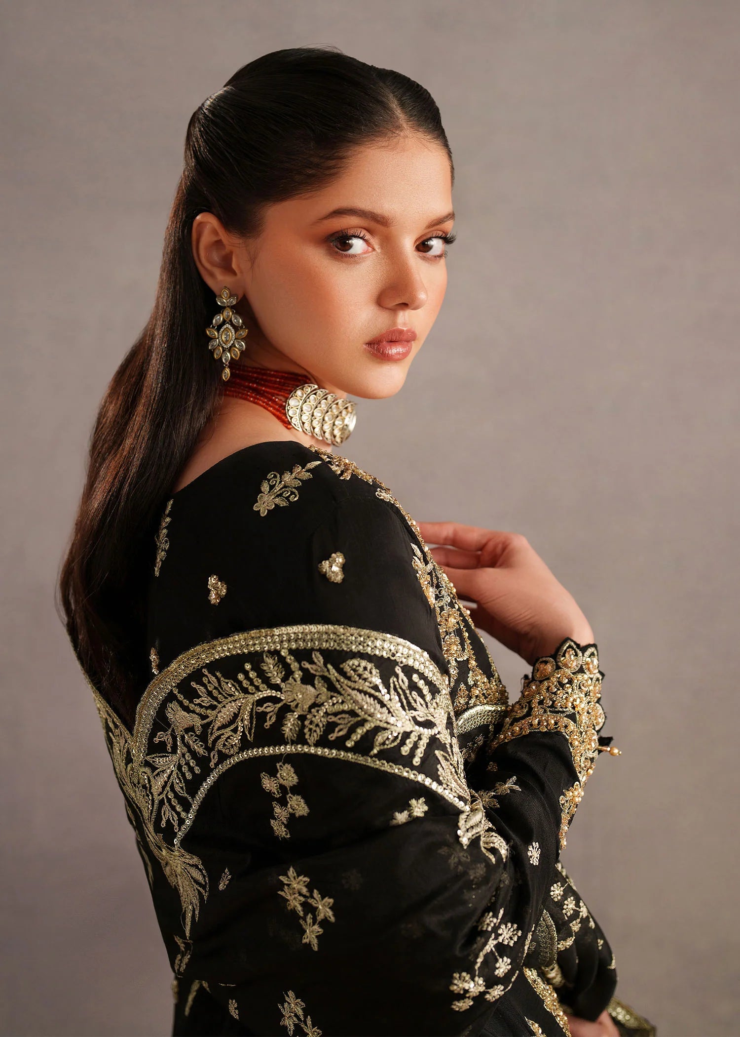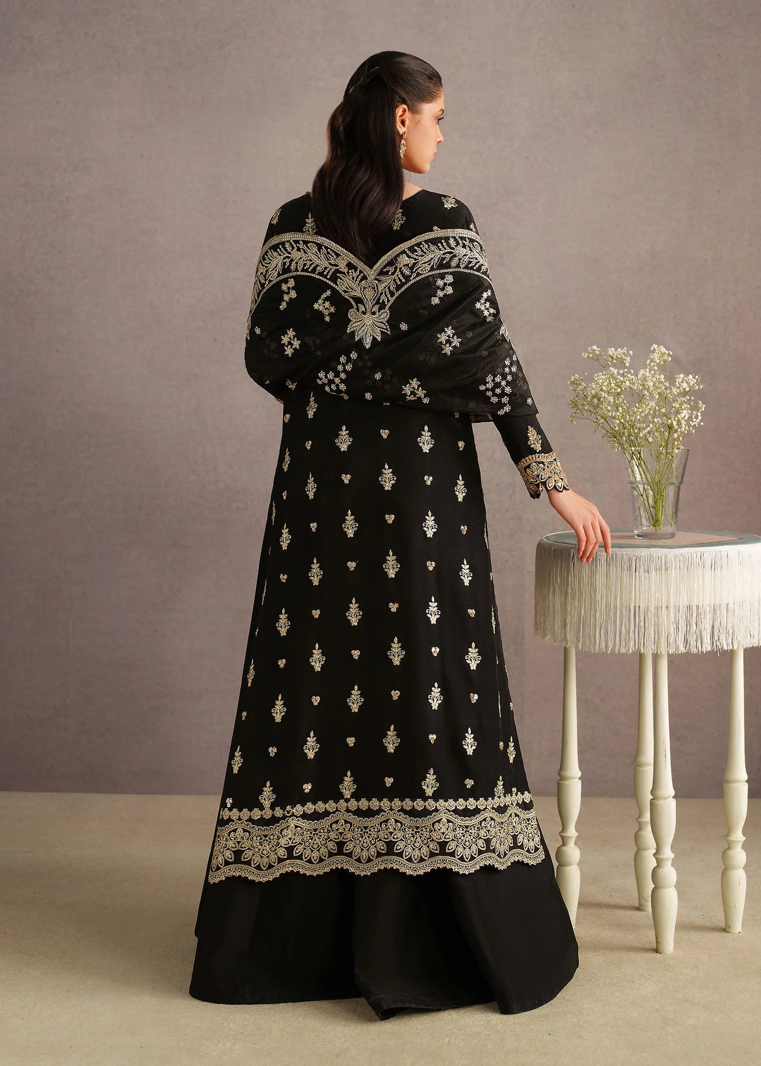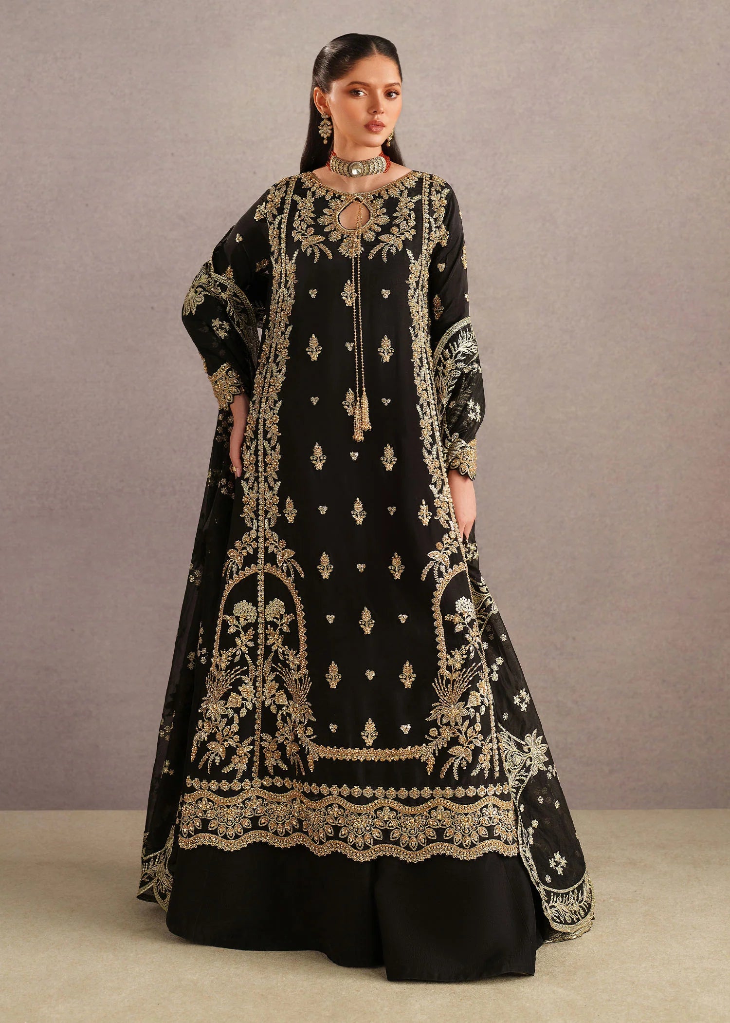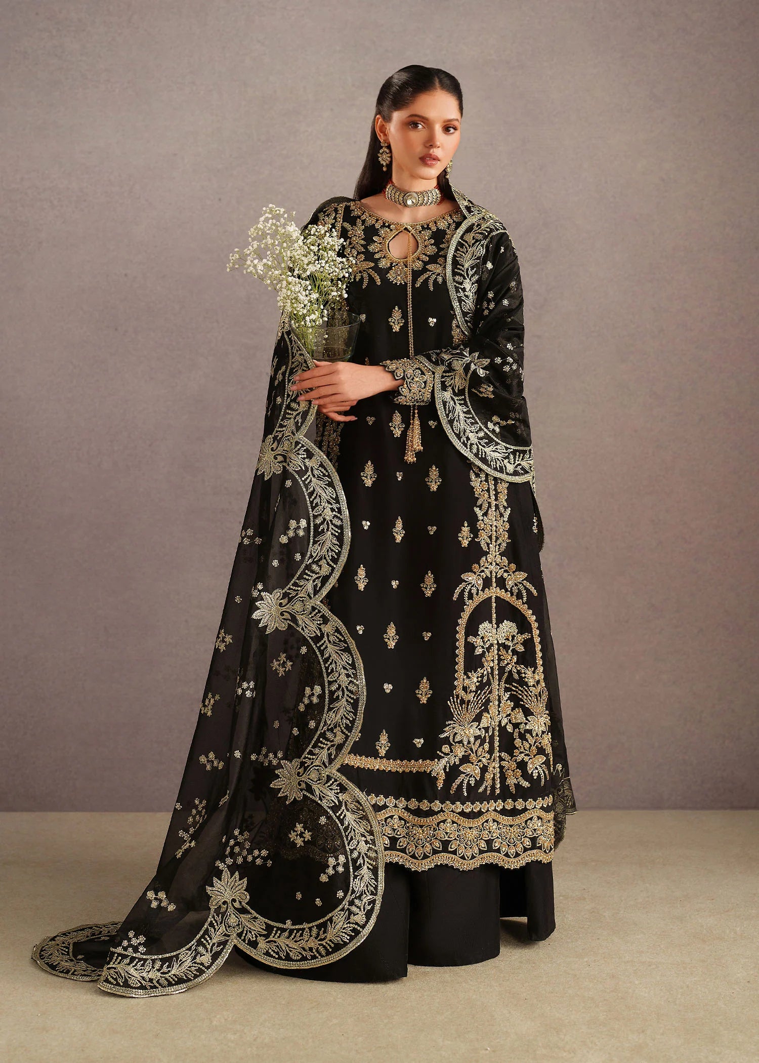 Paired with matching black bottoms, the look is elevated by a luxurious dupatta draped gracefully, showcasing heavy embroidered borders and intricate vine-inspired patterns. Finished with statement traditional jewelry, this ensemble is perfect for festive occasions, weddings, or formal evening events, offering a perfect blend of classic charm and contemporary grace.