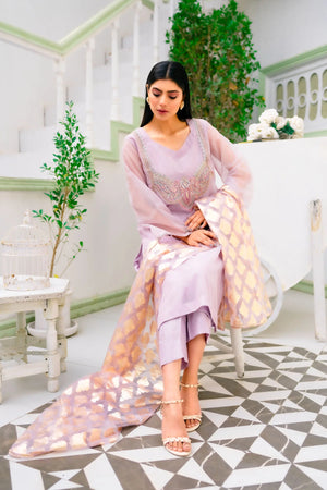 - Indulge in the allure of “Levander Dream,” a three-piece marvel marrying classic sophistication with modern elegance. With delicate piping throughout, this ensemble adorns itself in mashed Gotti 3D embellishments and double-shaded Tilla work. The organza dupatta, embellished with fancy broshia and lace, adds an ethereal touch to this dreamy attire, crafted from exquisite fabrics like organza, cotton silk, and viscose silk. Standing at 38 inches, our model brings this enchanting vision to life, inviting you into a world where glamour meets fantasy.