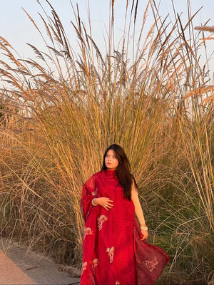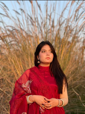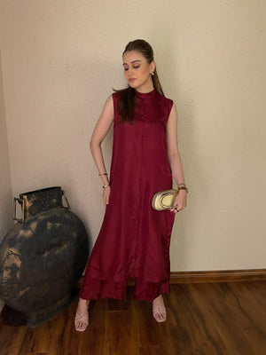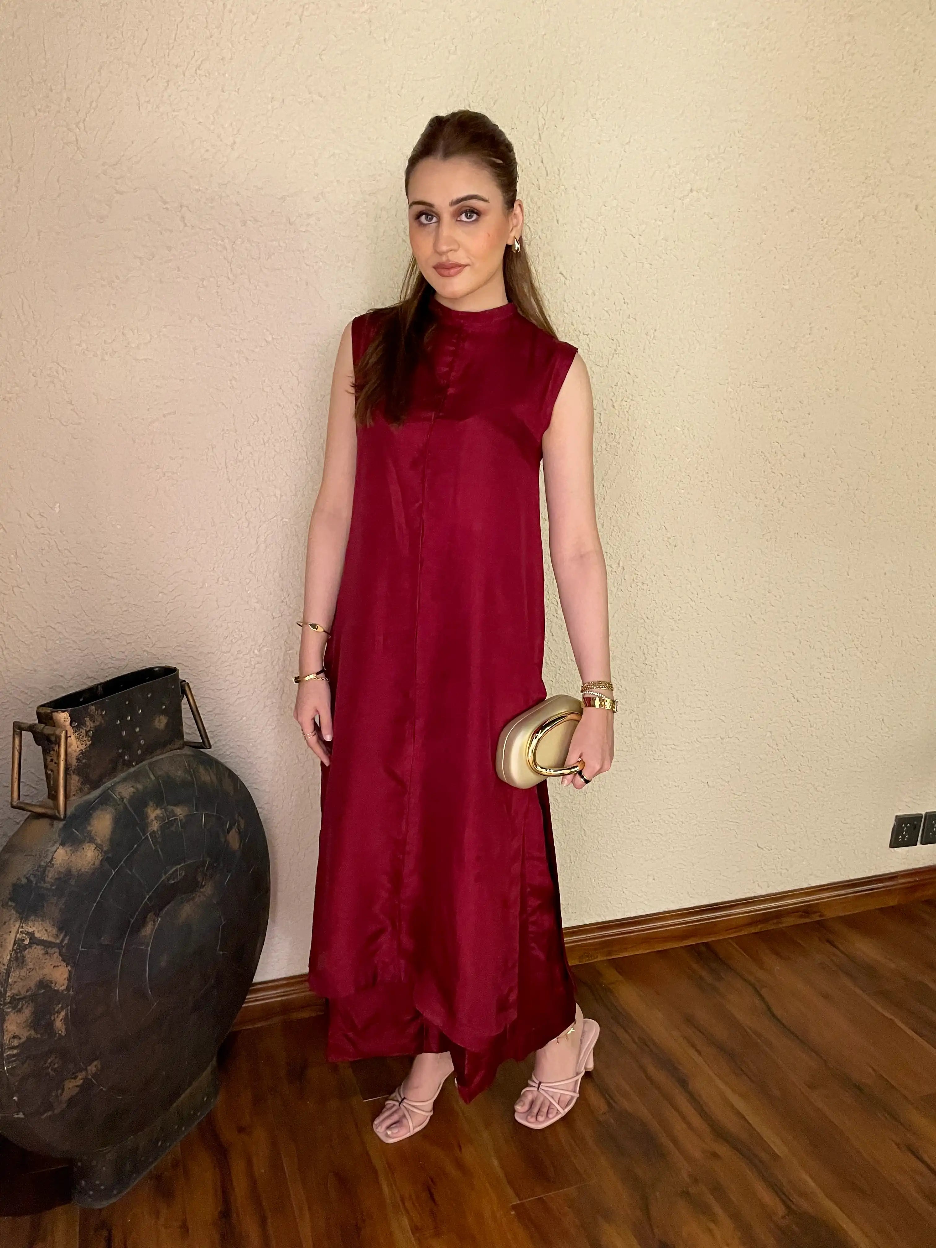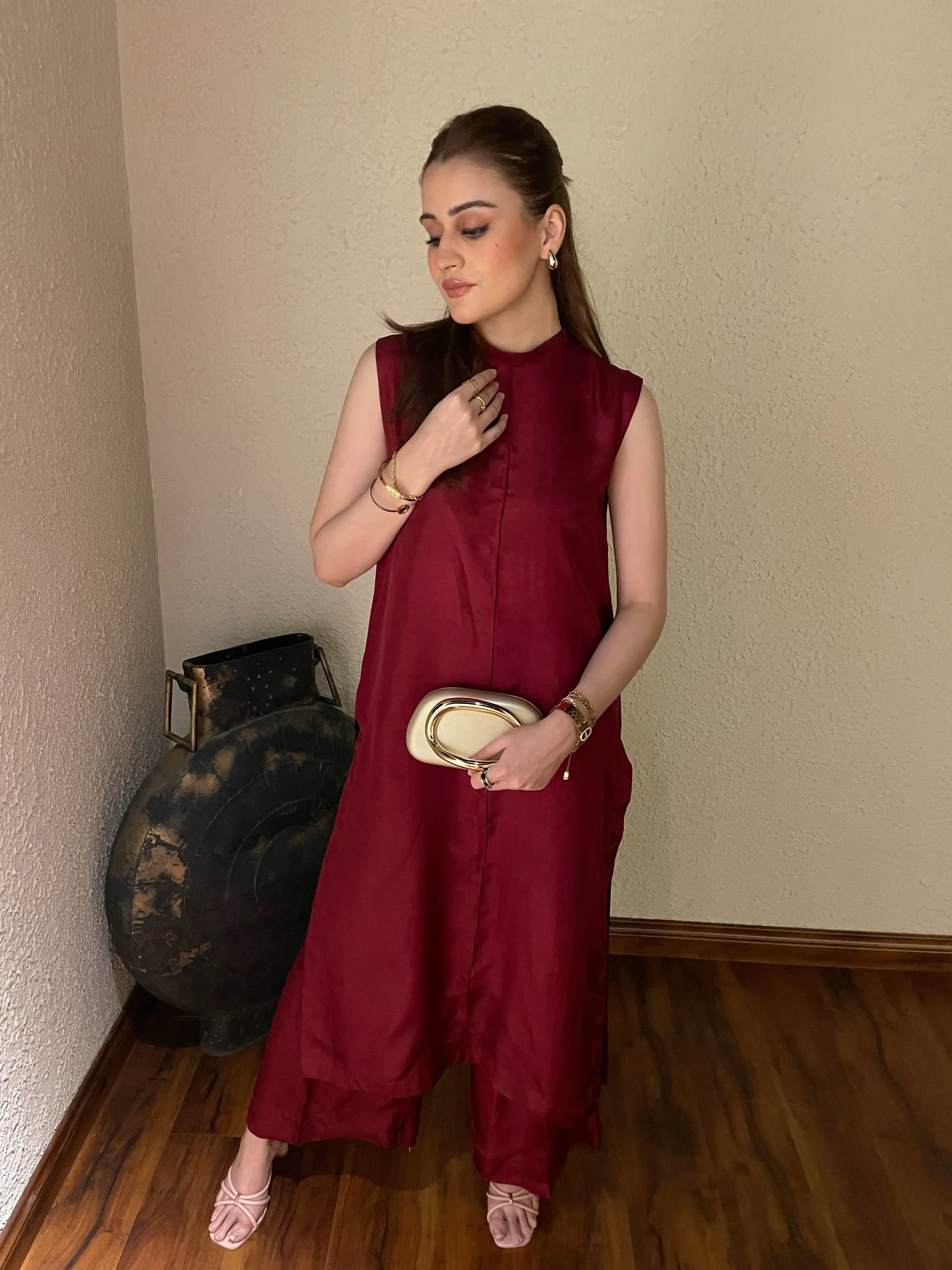 A chic 2-piece solid outfit in a sleek sleeveless design, crafted on rich tussel silk. The Luna Set offers a modern, minimal silhouette perfect for summer sophistication. Full sleeves can be added free of cost for added versatility.