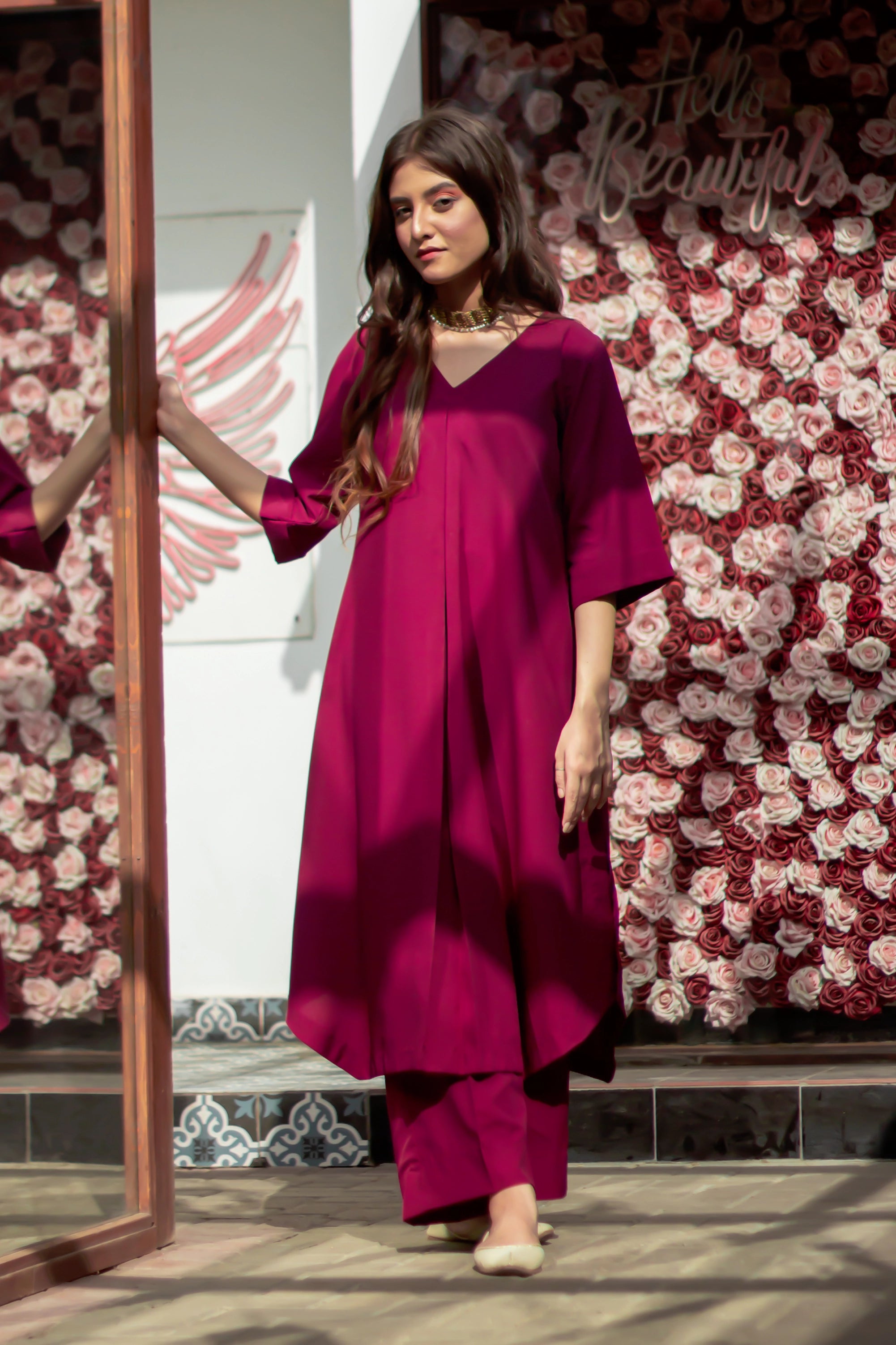 It’s a two piece malai georgette matching set includes a flowy shirt with front pleat along with cullote.