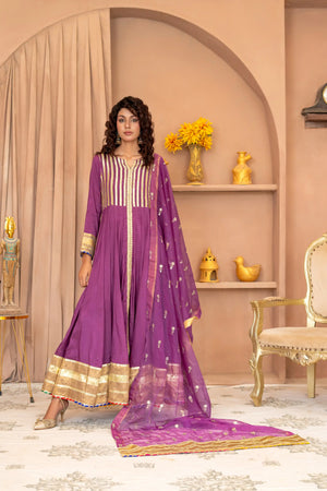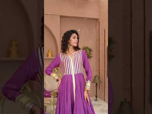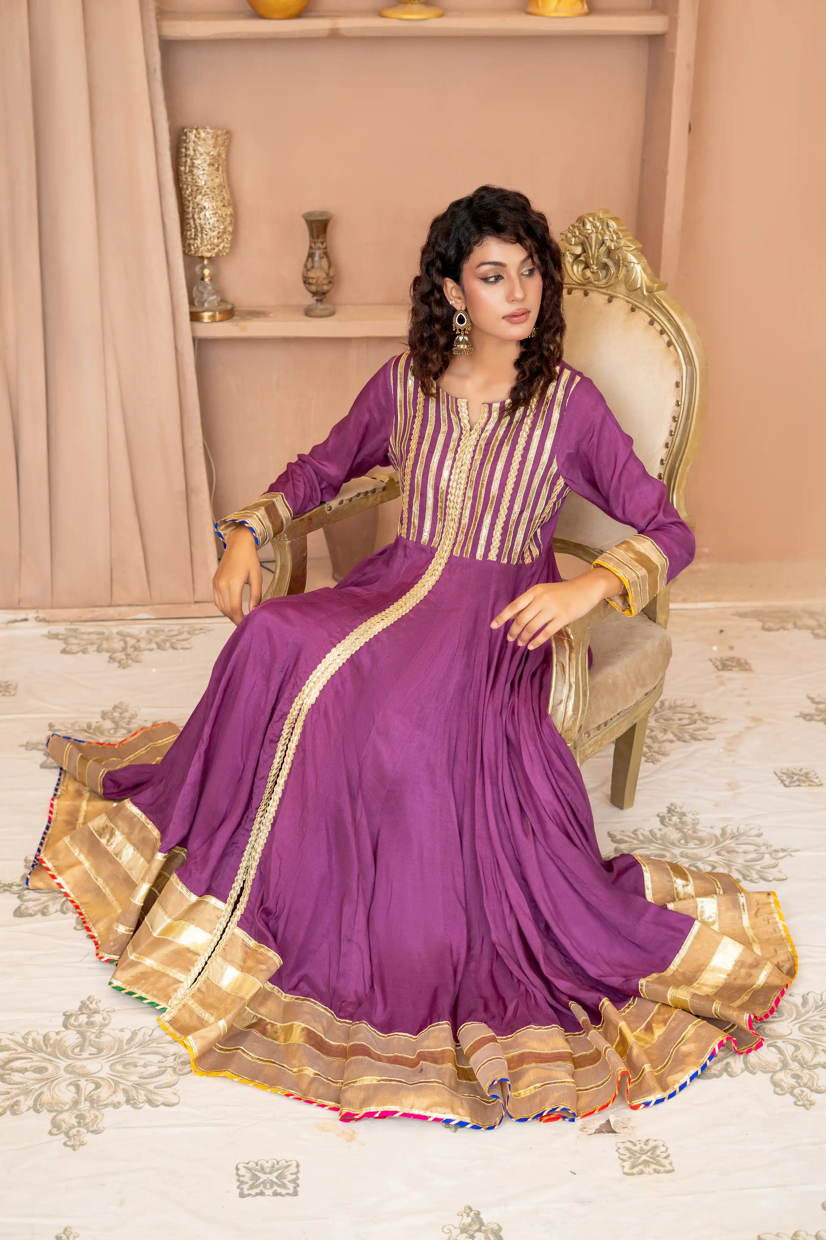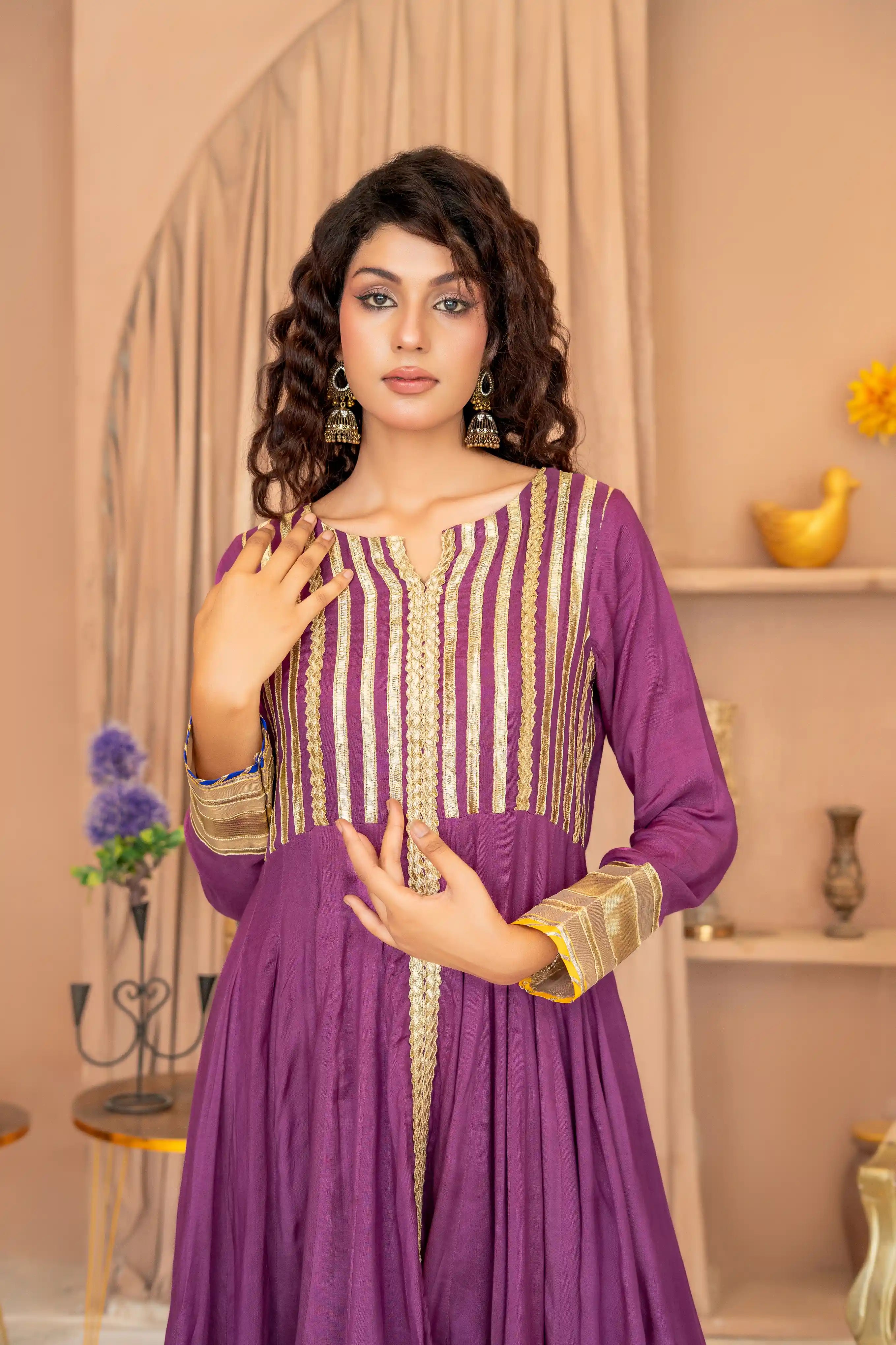 Introducing Mahgul, a luxurious kalidar pishwas crafted from cotton silk and paired with an embroidered organza dupatta, both adorned with delicate gotta detailing. Its front-open silhouette and classic churidar pajama beautifully blend traditional craftsmanship with contemporary sophistication—ideal for the festive season.