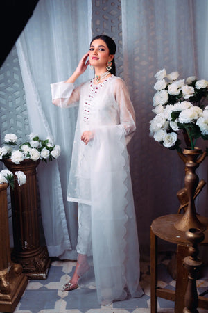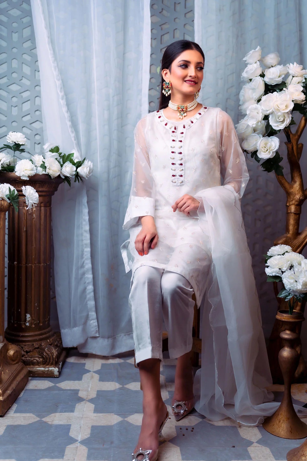 ♦️ Trouser Type: Straight Trouser/Capri. - The purity of white – will never be outdated. Our exquisite choice of gems and pearls on this pure white base colour rejuvenates the overall appeal. Embellishments and embroidery on a fine tissue organza fabric makes it a popular choice for selecting a minimal aesthetic. The straight cut shirt adds a contemporary touch.
