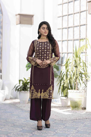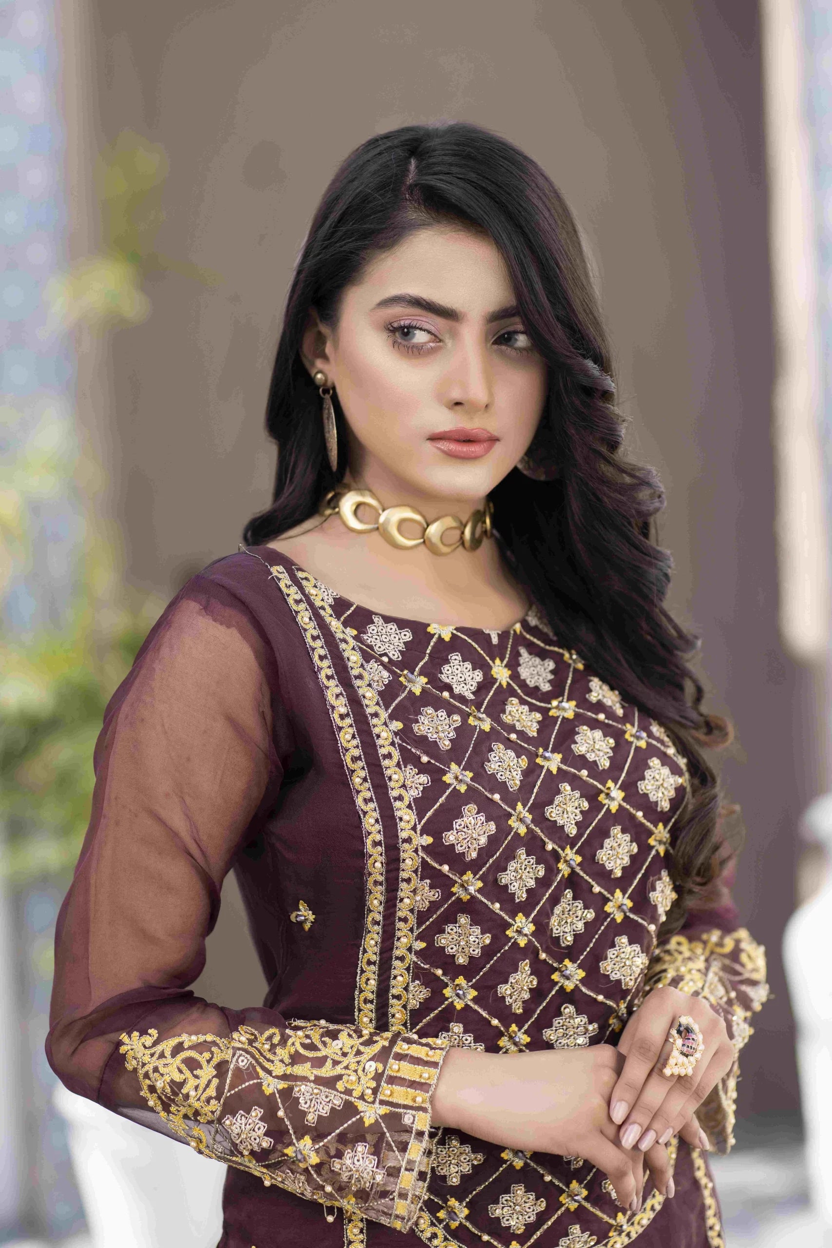 Ketifa ready to wear collection has presented some amazing color palettes in their recent organza series. Such as this Maroon Flame will make you fall in love with the flawlessly detailed handwork of kora and dabka. Classy embroidery work is done on the neck area along with daman. Sleeve corners are also covered with the same dull golden work which produces a glamorous effect on your appearance.
