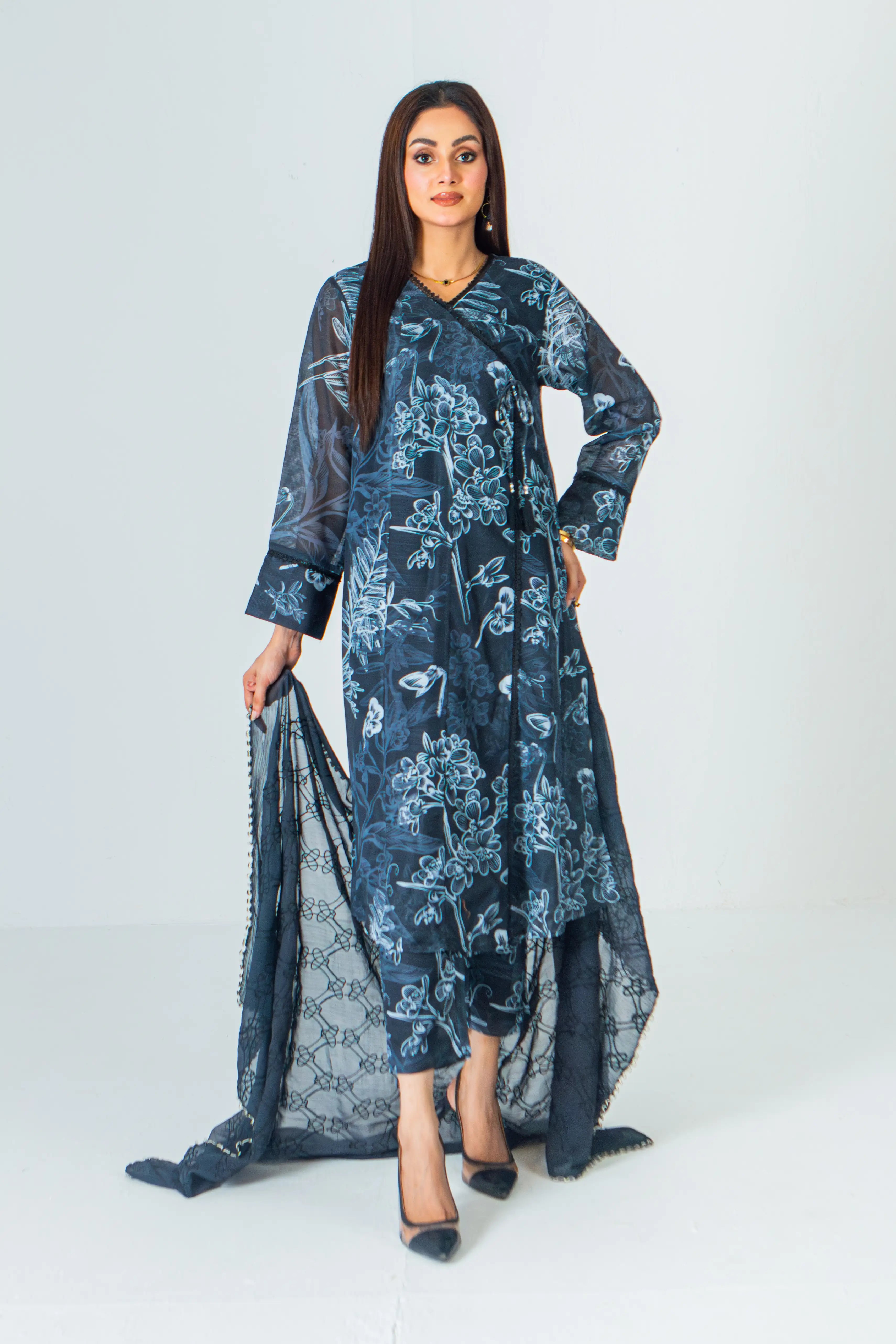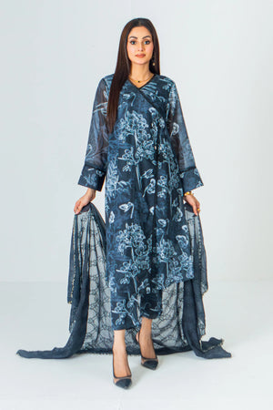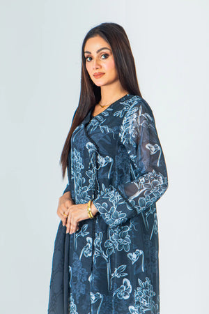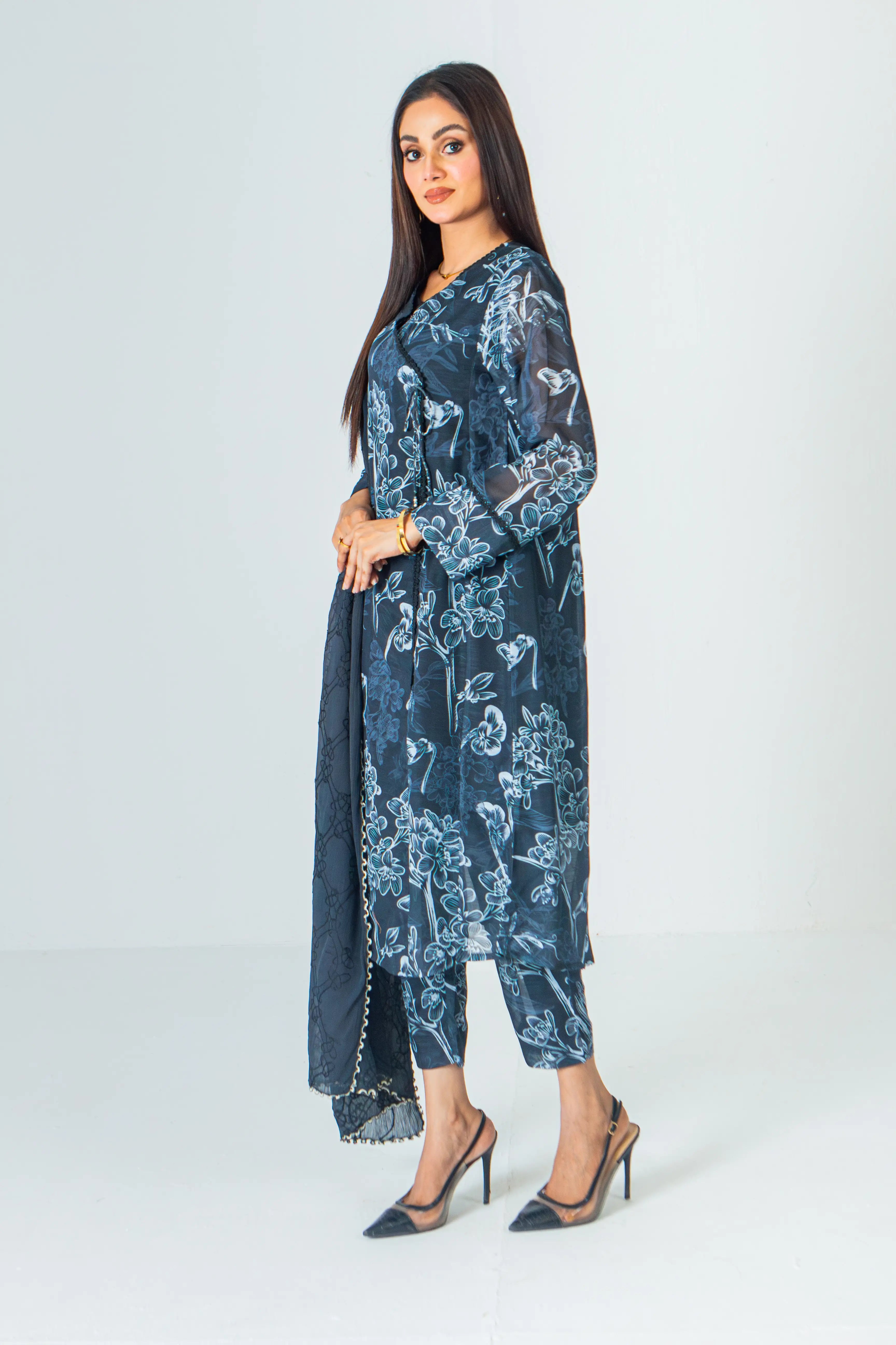 This outfit showcases a sophisticated ethnic ensemble featuring a deep blackish blue base with delicate light blue floral and leaf patterns. The outfit includes a flowing kurta paired with matching trousers, exuding an air of elegance and grace. Complementing the attire is a matching dupatta with intricate embroidery, adding texture and refinement to the overall look. The subtle contrast in colors and the detailed design make this outfit a perfect choice for formal events or special occasions, combining traditional charm with modern aesthetics.
