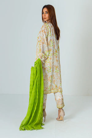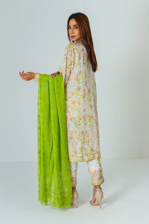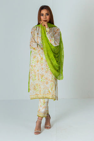 This outfit showcases a sophisticated ethnic ensemble featuring a white base with delicate light green floral and leaf patterns. The outfit includes a flowing kurta paired with matching trousers, exuding an air of elegance and grace. Complementing the attire is a matching dupatta with intricate embroidery, adding texture and refinement to the overall look. The subtle contrast in colors and the detailed design make this outfit a perfect choice for formal events or special occasions, combining traditional charm with modern aesthetics.