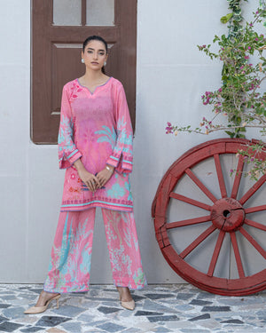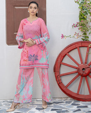 Meerab from our Aiwish Prints lawn collection blends timeless charm with modern flair — a beautifully stitched 2-piece co-ord set featuring a straight-cut kameez and culottes in a soft pink floral digital print, enhanced with delicate lace detailing.