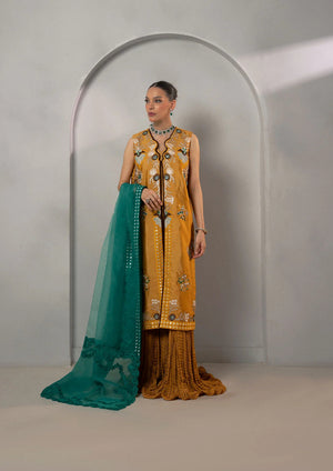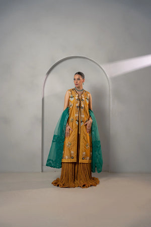 Turn heads with this regal 4-piece mustard gown ensemble, a perfect blend of bold color and intricate craftsmanship. The outfit features a sleeveless embellished gown, adorned with delicate work that adds a graceful shimmer and elevates the entire look. Beneath it lies a matching plain undershirt, offering comfort and coverage without compromising on style.