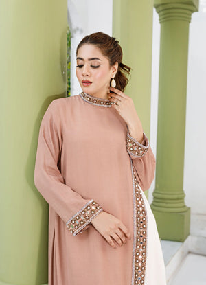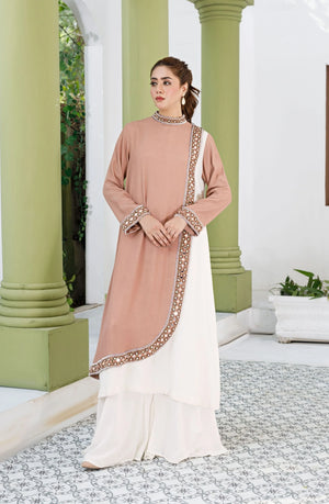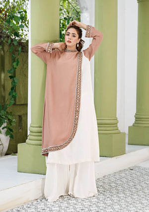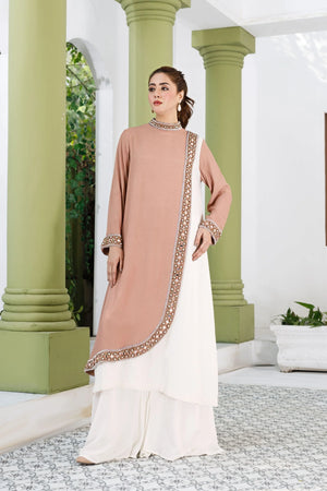 Where tradition meets creativity; this fusion shirt that catches the eye with a fascinating overlap style, Pair with a classic sharara. Beautifully handworked on the collar, cuffs and all around the overlapping panel.