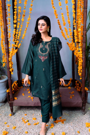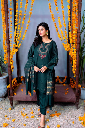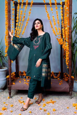 A solid green monotone is paired up with a gold patterned Dupatta and embroidery on the front of the shirt. This design is a good blend between style and comfort while celebrating traditions. Thread work is also prevalent to enhance its overall appeal and to add defining touches. A flower motif in the centre gives it a deeper meaning.
