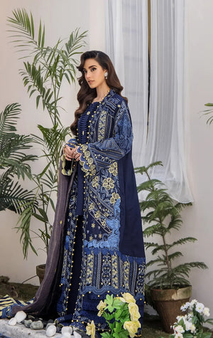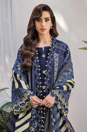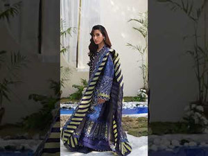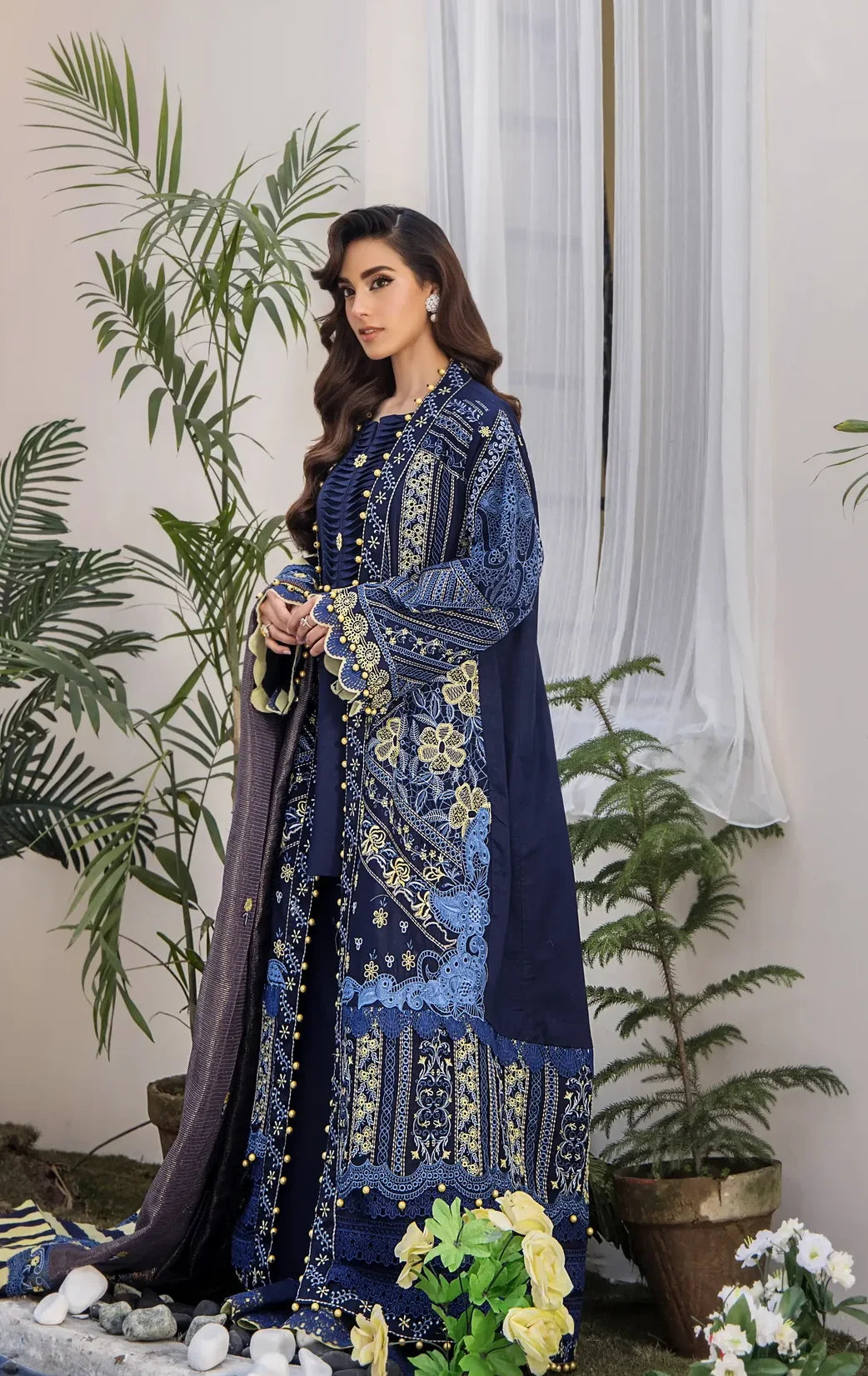 - Embrace the vastness of the desert with a mysterious beauty in “Midnight Mirage”. Inspired by the tranquil beauty of desert nights, with it’s Front 2 embroidered panels left, right and embroidered border for front and back exudes an air of mystery and elegance. Enveloped in a medium dark blue reminiscent of twilight over dunes. Inspired by the mystical aura of the desert, it’s Embroidered cotton zari net dupatta carries a sense of enchantment and mystery. Revel in the magic of the desert with “Aurora’s Secret” and unveil your own captivating story.
