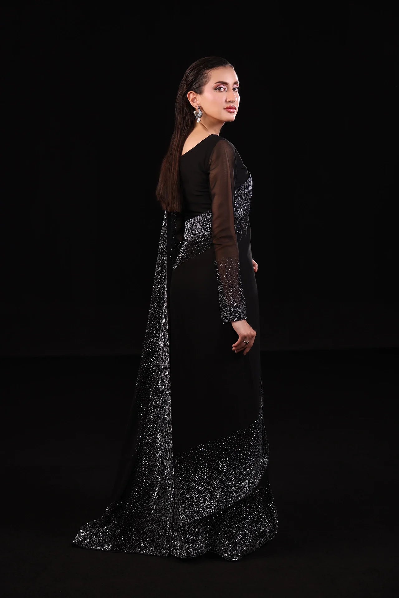 Midnight Muse Embroidered Chiffon Saree 3Pcs