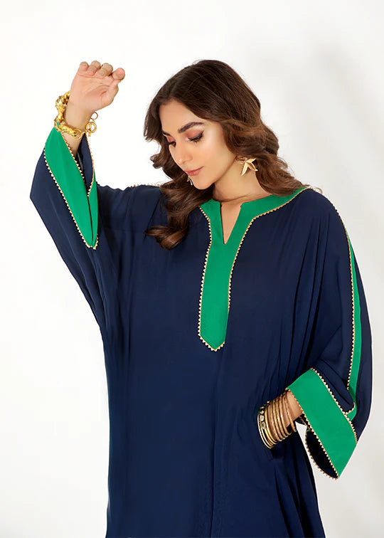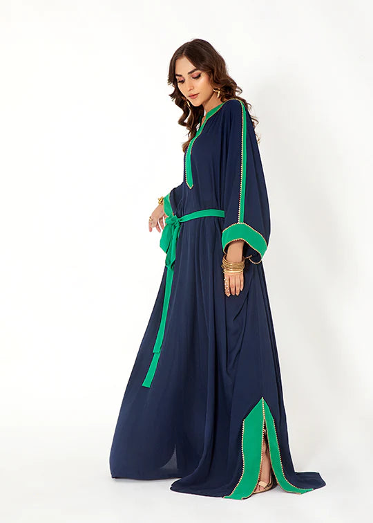 The “Midnight Sky” Kaftan Dress is crafted in a rich indigo color, reminiscent of the deep hues found in the night sky. Adding a touch of enchantment, the dress features delicate green lace detailing that highlights the neckline, sleeves, or hem, accentuating the beauty of the indigo fabric. To elevate the attire further, golden detailing adorns the neckline, creating a captivating contrast against the indigo fabric. The golden accents shimmer and catch the light, reminiscent of stars twinkling in the midnight sky.