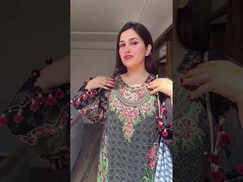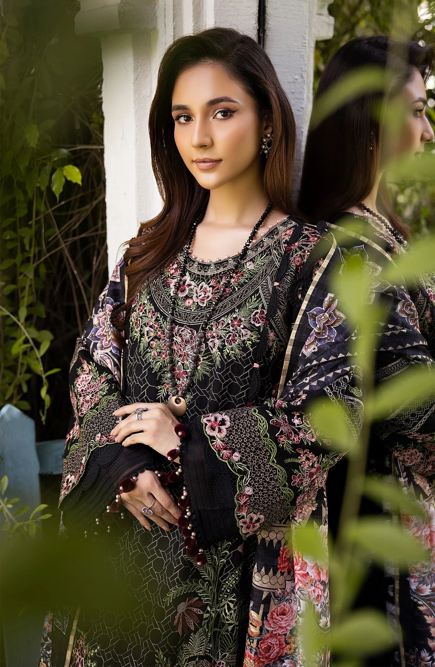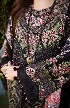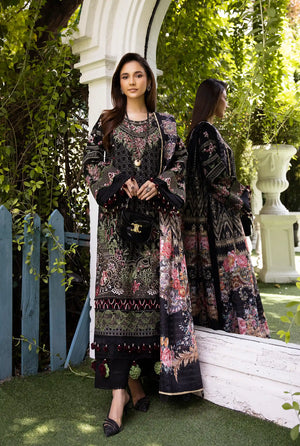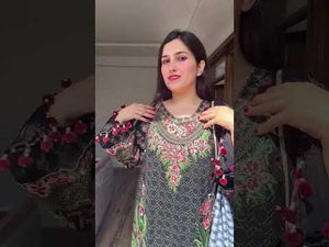 The "Midnight Sparkle" suit exudes elegance with its deep black base adorned with intricate floral and geometric patterns. The rich embroidery on the shirt and sleeves adds a touch of sophistication, while the dupatta features a stunning mix of colors that enhance the outfit’s charm. This ensemble offers a graceful yet bold look, perfect for evening wear, ideal for making a statement on any occasion.