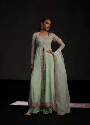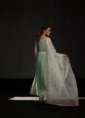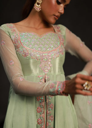 The Mint Glow Set is a refreshing vision of elegance, featuring a kalidaar shirt with a center-open cutline, beautifully embroidered in sequins and thread work with pastel hues on a soft mint base. Paired with flared dhaka pants for a graceful silhouette and an embroidered organza dupatta, this three piece ensemble blends dreamy colors with exquisite craftsmanship a combination that feels truly timeless.