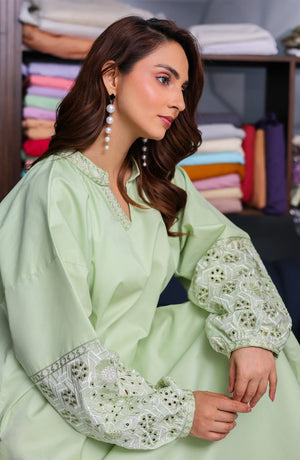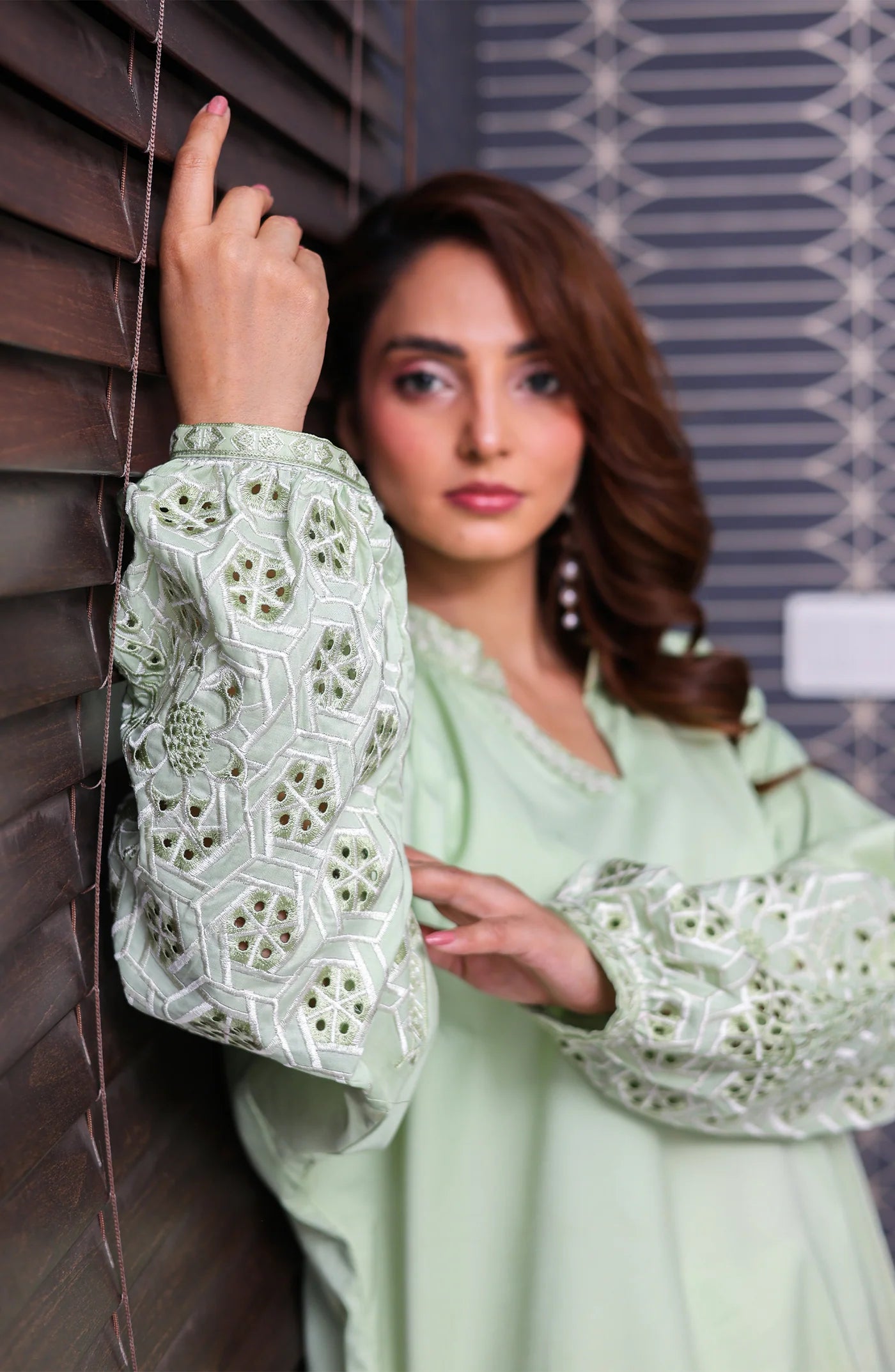 This ensemble features a loose-fit long shirt in a refreshing mint green hue, crafted from premium fabric that ensures both breathability and a graceful drape. The shirt is adorned with bold, intricate embroidery that adds a touch of artisanal charm. Puff sleeves lend a feminine silhouette, while delicate gathers at the neckline enhance the overall femininity of the piece.