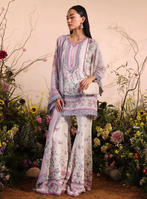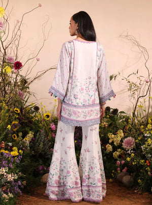 This pastel-hued shirt set is a true embodiment of soft elegance and breezy summer vibes. The pristine white base is adorned with delicate floral prints in shades of pink, lavender, and green, evoking the serene beauty of a blooming garden. The shirt features an intricately designed yoke with lace detailing along the sleeves and hemline, adding a refined touch to the overall look. Paired with flared pants, it creates a flowy silhouette, making this ensemble perfect for both casual outings and semi-formal occasions. The matching dupatta, decorated with subtle stripes and floral accents, adds a delicate hint of femininity, completing a cohesive and effortlessly elegant outfit.