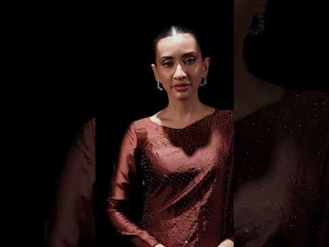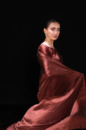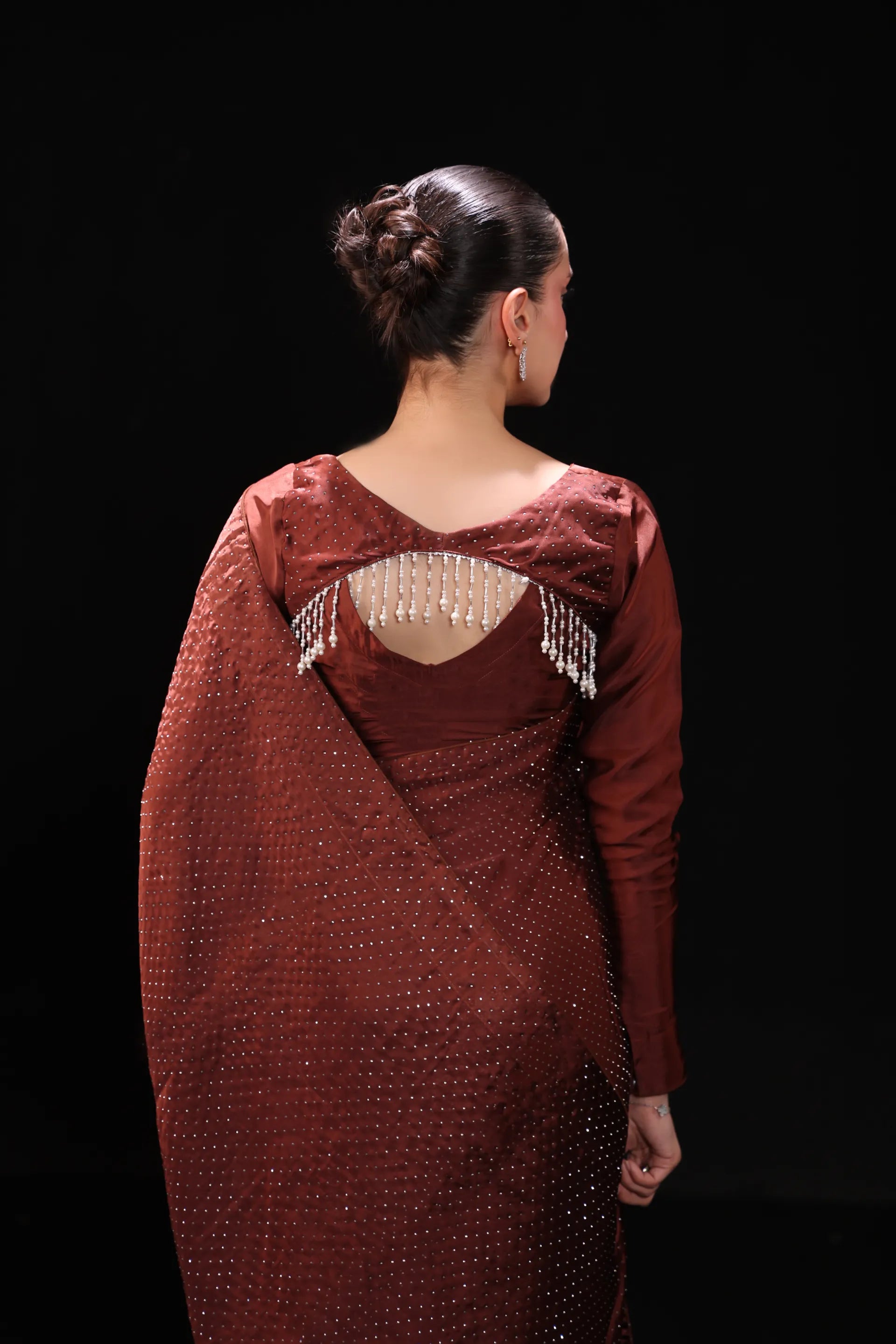 Mocha Mirage brings rich, earthy glamour to life. The luxurious drape of Korean silk flows like molten chocolate, while the rhinestone embellishment adds just the right amount of shimmer. The blouse features sculpted tailoring with a defined back cut to elevate your presence with quiet drama.