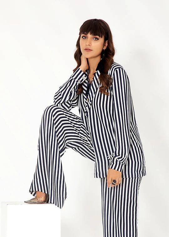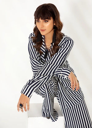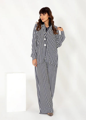 Our ‘Monochrome Voyage’ nautical blazer shirt takes inspiration from classic naval aesthetics, featuring bold black and white stripes that evoke a sense of nautical charm. The blazer-style design features a structured collar and sleek lapels to complete the look, exuding a sense of elegance and sophistication. Paired with the blazer shirt are culottes in the same striking black and white stripe pattern; the “Mariner’s Voyage” set is crafted with meticulous attention to detail and uses high-quality materials, ensuring durability and comfort.