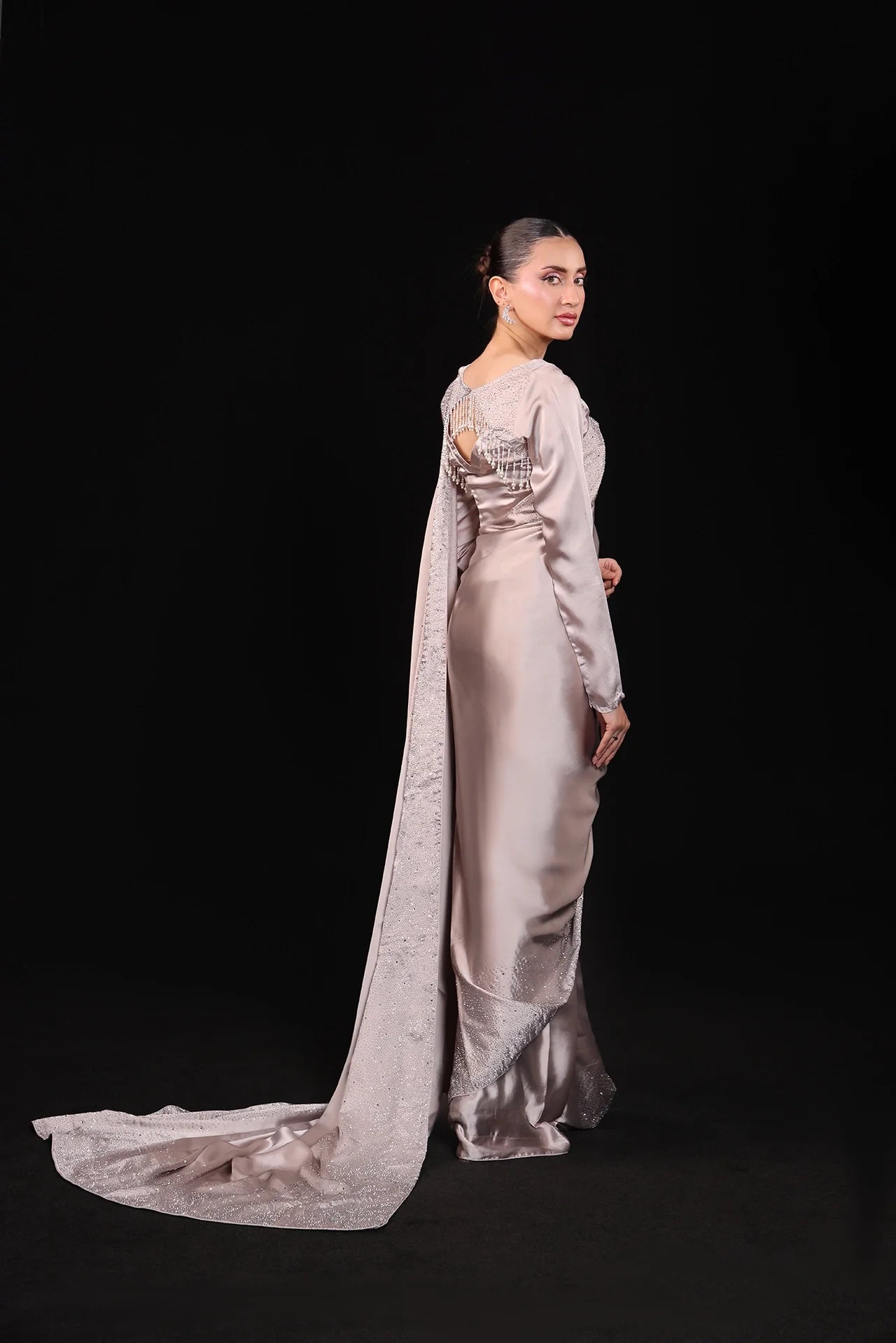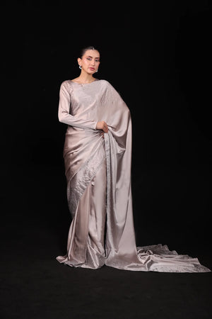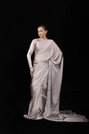 Moon Dust embodies minimalistic luxury in its purest form. Crafted from the finest quality silk, its sleek, effortless drape exudes quiet sophistication. Entire saree is embellished with rhinestone work. The back features a very stylish cutout style to make you stand out.
