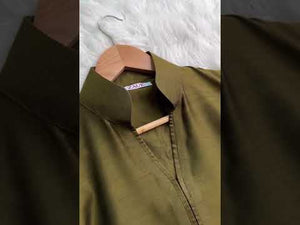 Moss green matching set includes high collar shirt with puffy sleeves along with straight pants in-house khadi cotton fabric suited for winters.