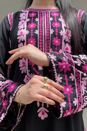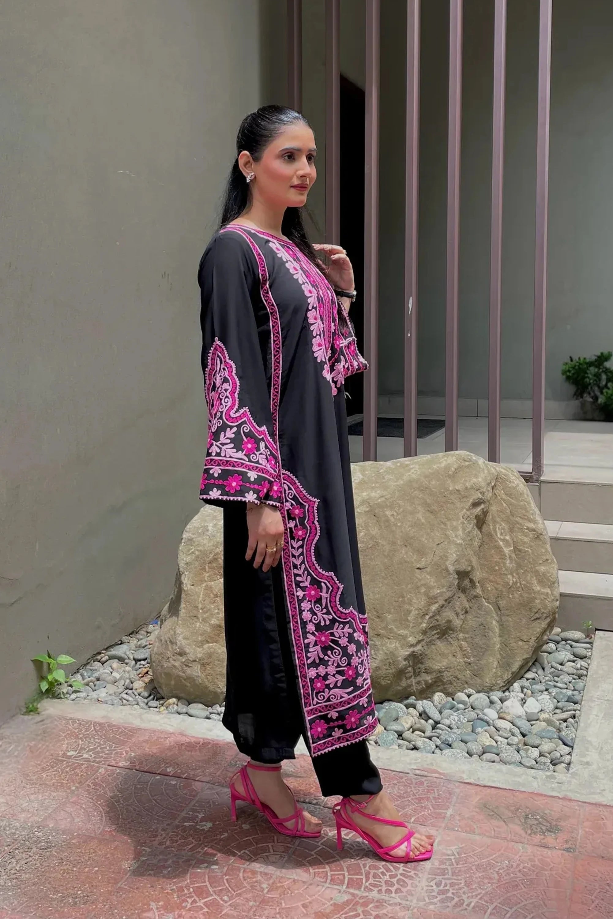 Beautiful fusion of colour, embroidery on long shirt with plain pants