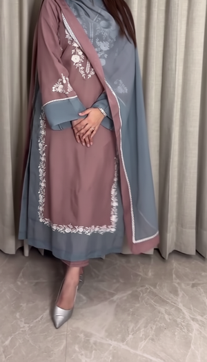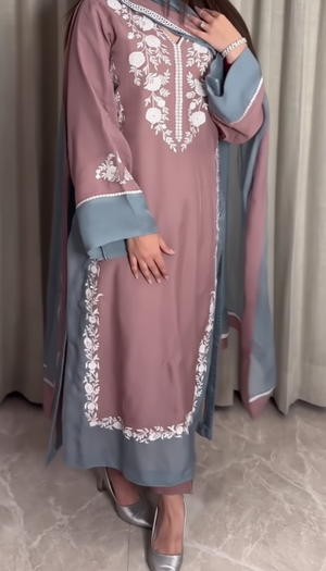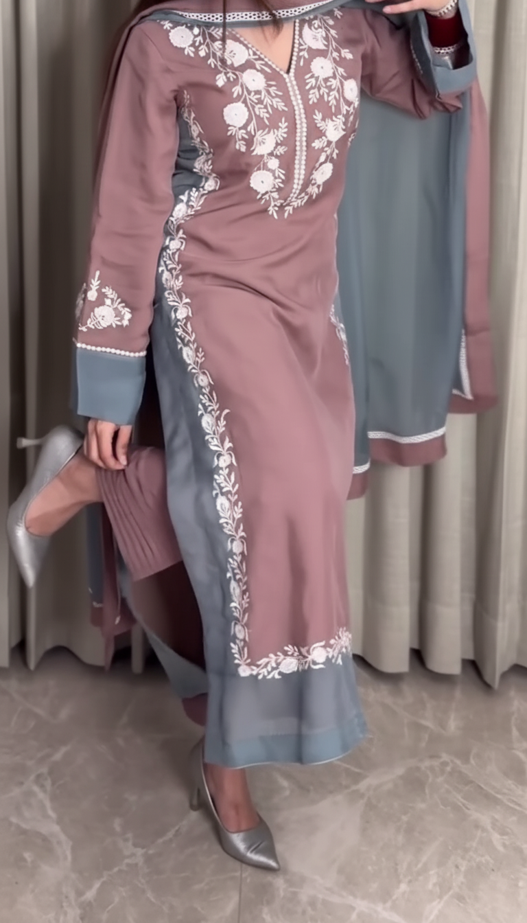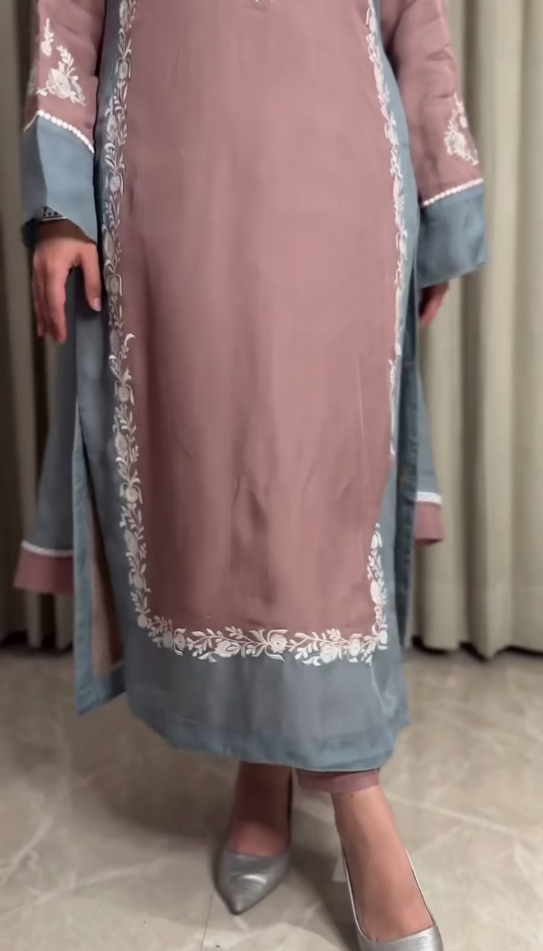 Introducing Mystique, a majestic three-piece ensemble where modern color meets timeless craftsmanship. The shirt and trouser are tailored from luxurious raw silk, ensuring a regal drape. The shirt, featuring a beautiful contrast-colored cuff and hem, is adorned with intricate white floral embroidery on the neck, sleeves, and elegantly framing the front panel. The stunning, solid-colored dupatta is crafted from soft imported georgette and finished with delicate embroidered lace, completing this look of absolute grace. 🌙✨