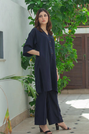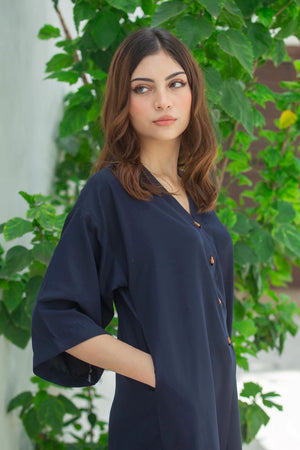 Navy blue v-neck shirt with side pockets in it along with culotte