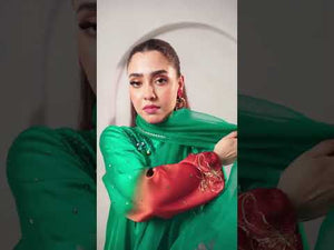 Paired with a coordinated trouser in the same luxe fabric, the outfit maintains a sleek and elegant silhouette. A plain matching dupatta balances the overall look, letting the two-tone contrast and embellishment work shine without overwhelming the ensemble.