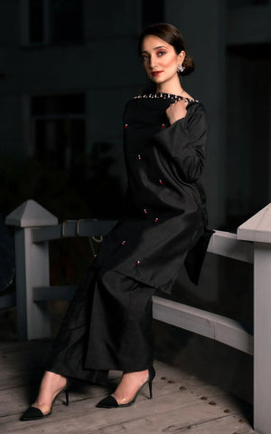 Immerse yourself in the magic of our newest creation - a Limited Edition to our growing range; presenting you Night Fall. A ravishing beauty in black raw silk comes to life with delicate stones in a maroon tint. We have glamorised a simple boat neck with our handcrafted work just on the right places. This dress is our designers pick and you can wear this ensemble when you just want to leave a solid mark without being too indulgent.
