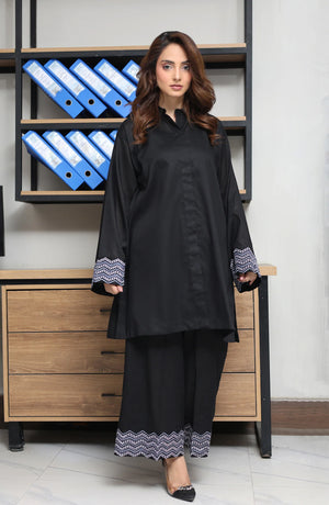 This ensemble features a loose-fit, drop-shoulder shirt in classic black, offering a relaxed yet sophisticated silhouette. A front slit adds a contemporary touch, enhancing the overall design. The sleeves are adorned with bold embroidery, adding a touch of artisanal charm. Complementing the shirt are wide-leg trousers that mirror the sleeve embroidery, creating a cohesive and stylish look.