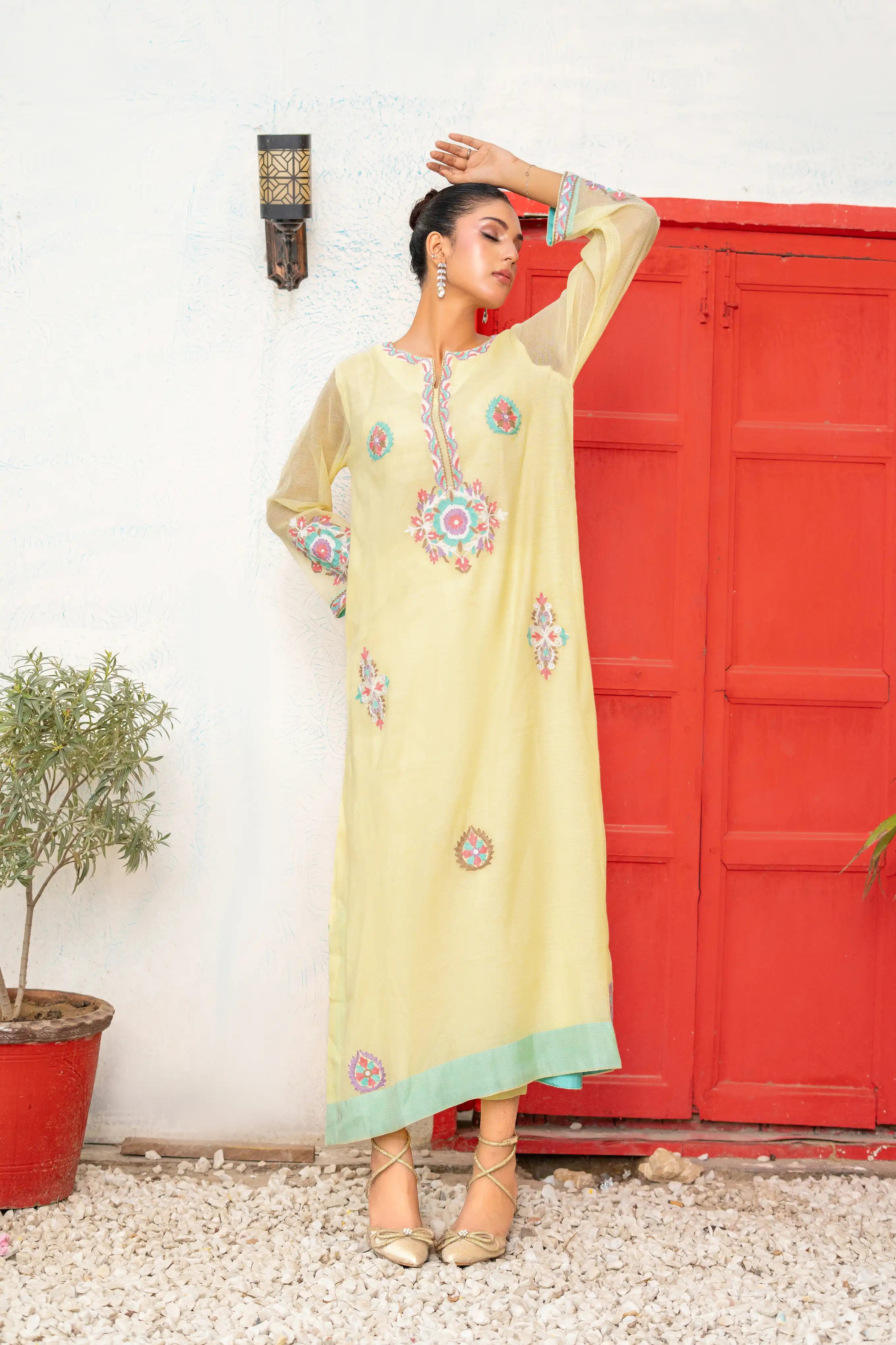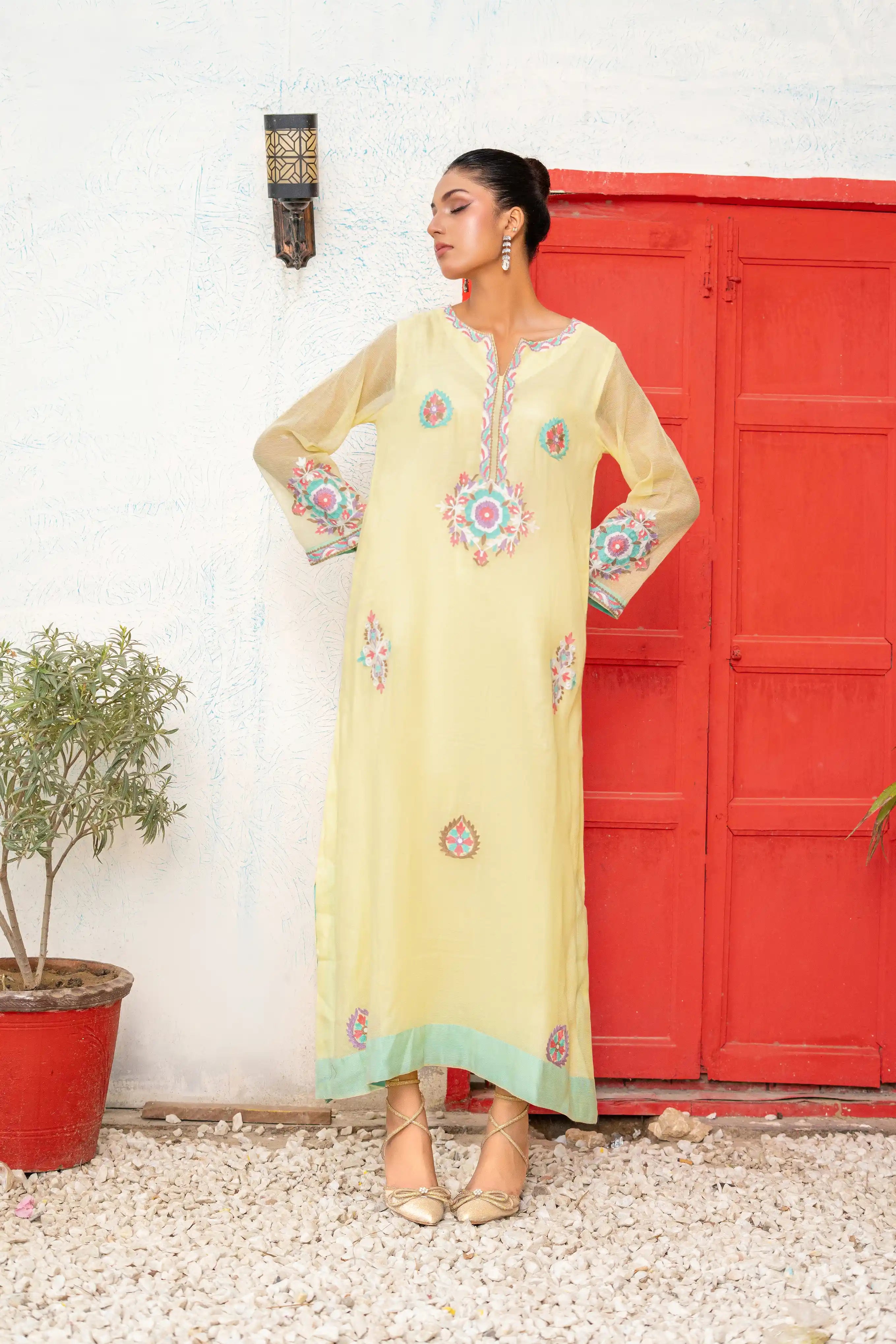 Step into effortless elegance with Nisha — a ready-to-wear embroidered kaftan crafted from luxurious butter yellow khaadi net fabric. Featuring delicate pastel aari work and paired with a matching raw silk inner and pants, this outfit is the definition of modesty with a modern twist. Designed in a trendy, easy-breezy cut that flatters all body types.