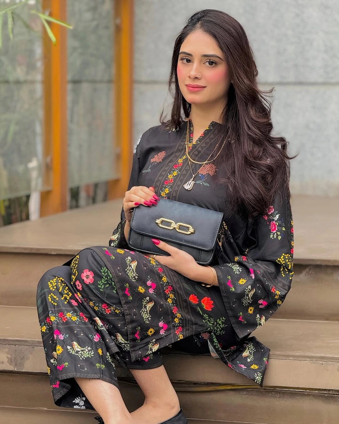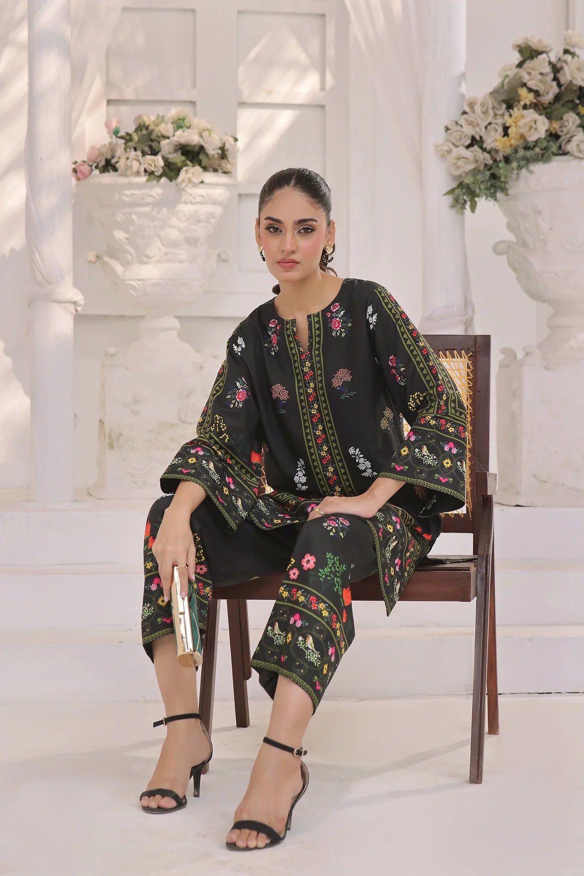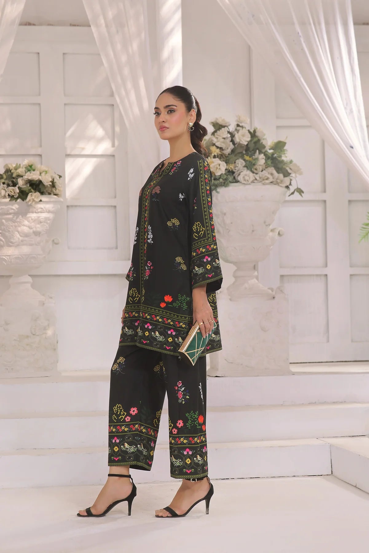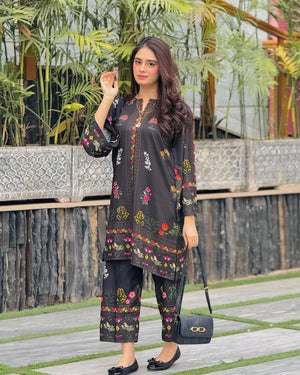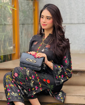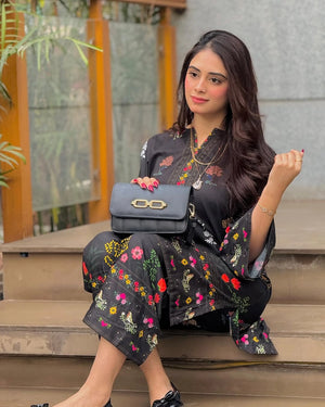 This deep black lawn silk co Ord set features vibrant tiny flowers, exuding bold elegance and playful charm. With luxurious fabric and an airy round net short shirt, it’s a captivating choice for any occasion.