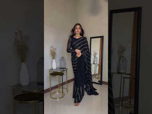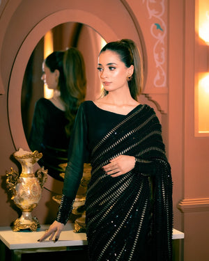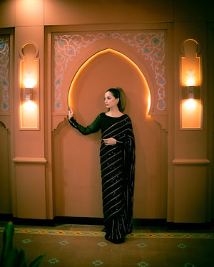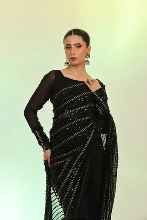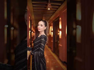 A statement of refined elegance. This exquisite chiffon saree is adorned with intricate tilla embroidery, shimmering sequins, and delicate pearl embellishments, creating a luminous interplay of texture and light. Designed to drape effortlessly, it is paired with a sleek chiffon blouse and a fluid malayi petticoat for an impeccable silhouette. An embodiment of timeless sophistication.