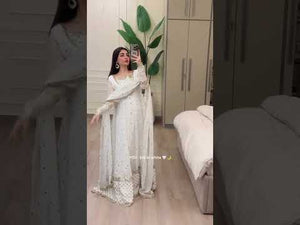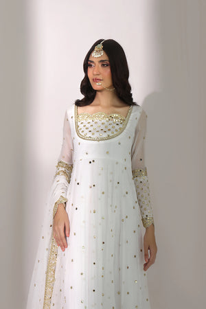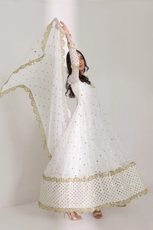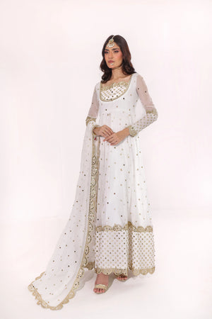 This elegant white Kalidar frock is made from premium chiffon fabric, featuring intricate embroidery work throughout. The frock is paired with a matching chiffon dupatta, adorned with a scalloped lace border and shimmering accents, making it an ideal outfit for festive occasions, weddings, or celebrations.