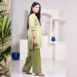 Make a statement in Noor, a stunning pistachio Farshi Shalwar set crafted in premium raw silk with delicate embellishments on the shirt and shalwar. Paired with a matching organza dupatta featuring intricate detailing, this ready-to-wear 3-piece ensemble is the perfect choice for Eid, festive celebrations, and weddings.