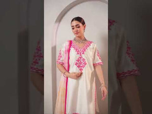 Radiate elegance with this beautifully crafted 3-piece white sheesha silk outfit, designed for refined festive wear. The embroidered shirt features intricate sheesha (mirror) work that adds a soft sparkle and traditional charm to the luxurious sheesha silk fabric. Delicate threadwork further enhances the graceful design, making it both timeless and eye-catching.
