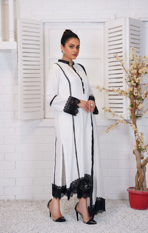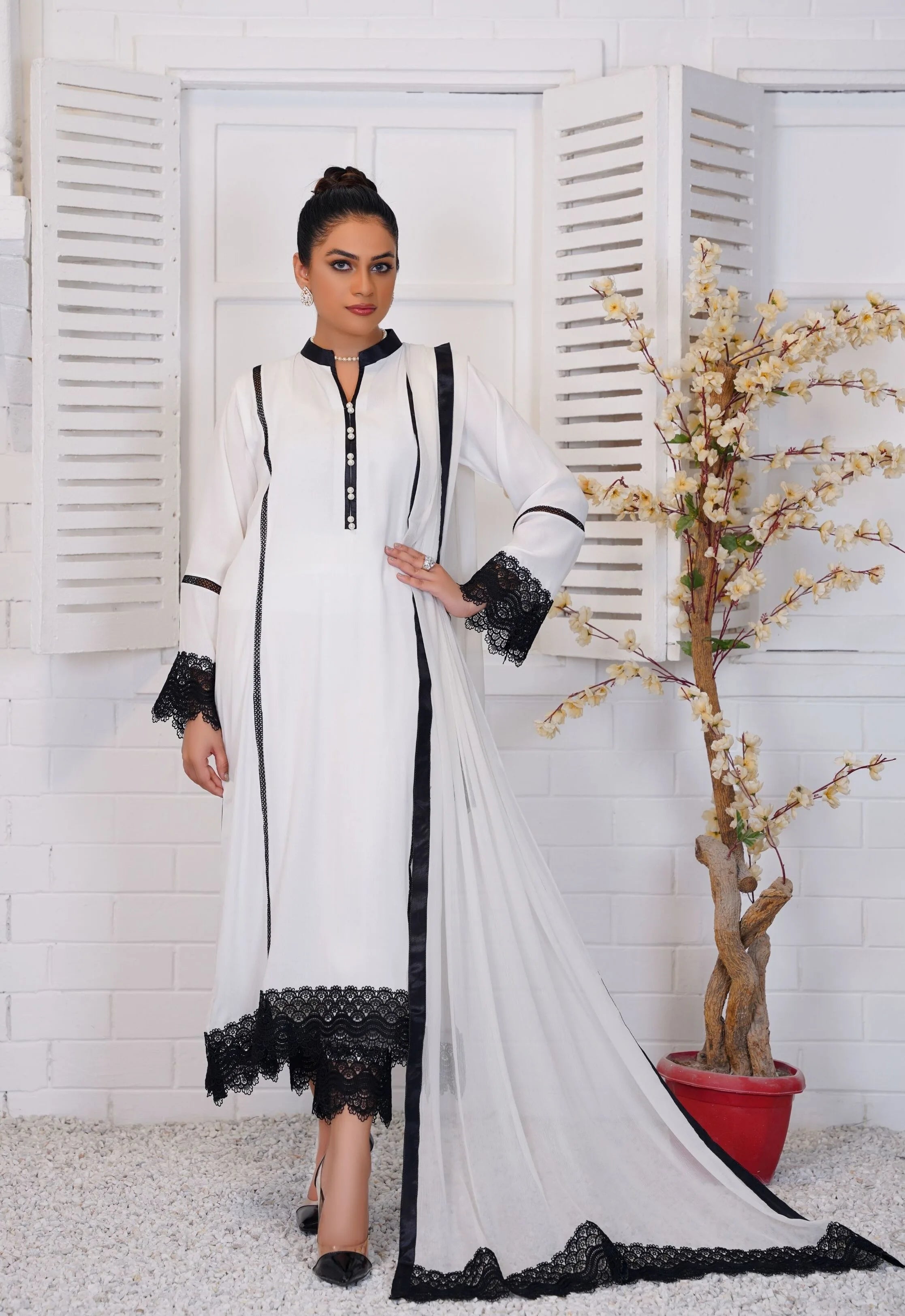 A classic black and white shirt in grip georgette. Enhanced by contrasting lacework that looks extremely sophisticated. Pair it with a matching white dupatta and pants, finished with black lace work.