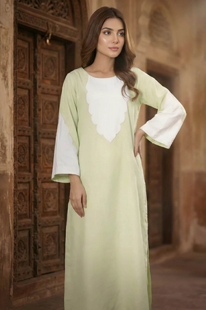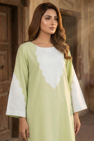 Step into festive elegance with Nyra, a graceful pastel green 2-piece stitched ensemble perfect for Eid celebrations and special occasions. The outfit features a long shirt adorned with delicate white applique on the neck and sleeves, paired seamlessly with matching trousers for a polished, ready-to-wear look.