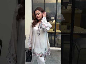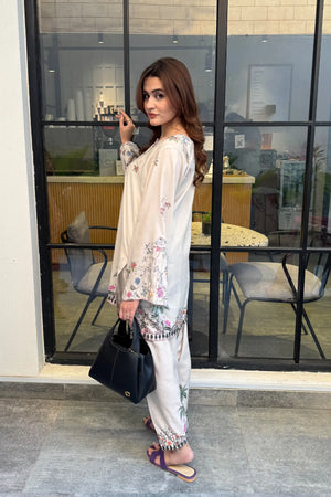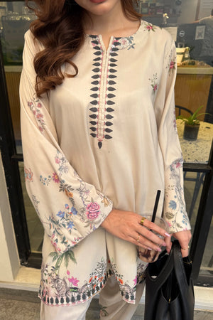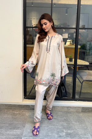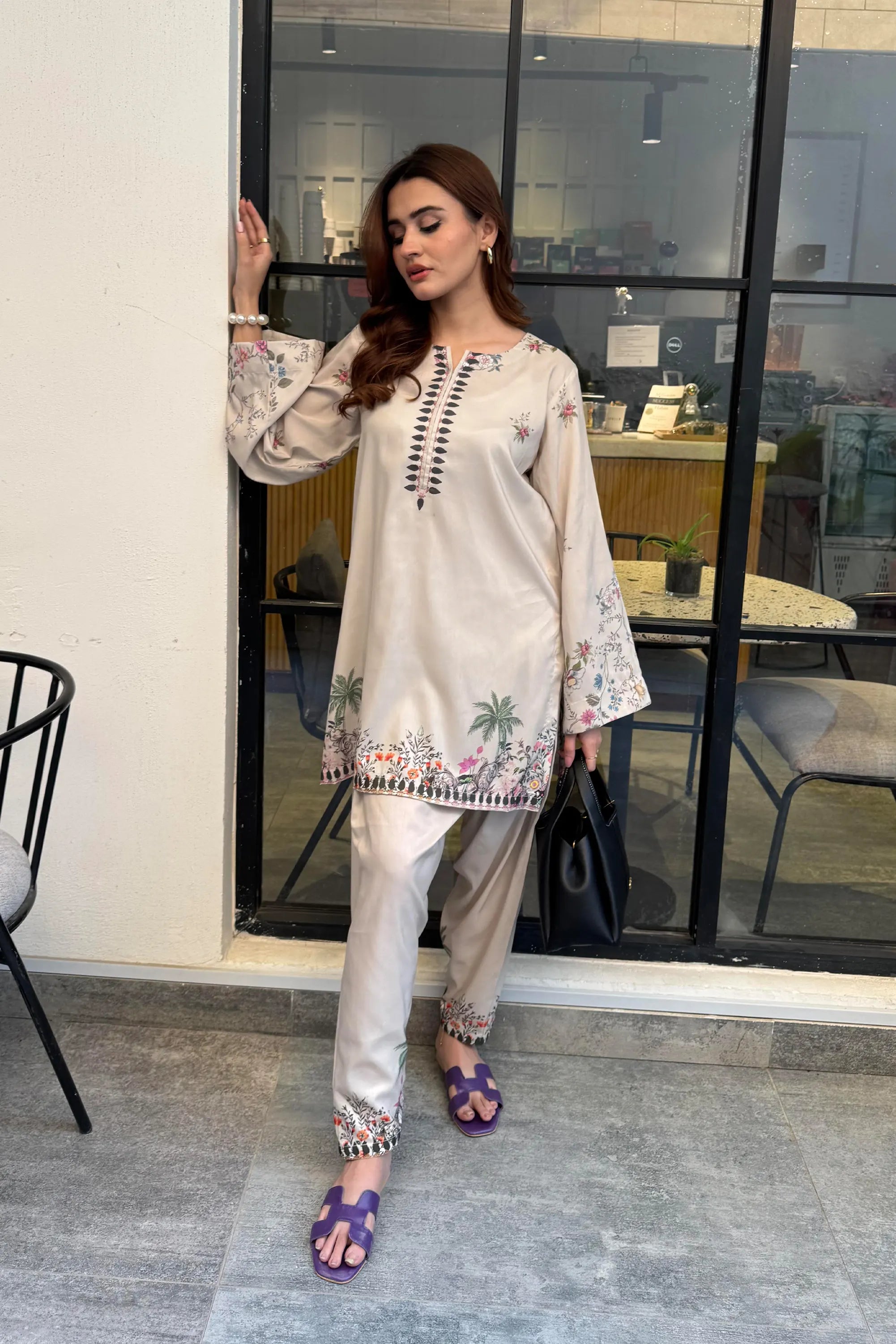A soft beige 2-piece set crafted in breathable Poly Lawn with delicate printed borders. Perfect for everyday winter elegance.